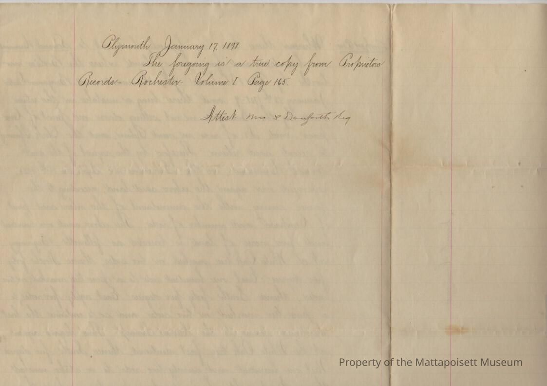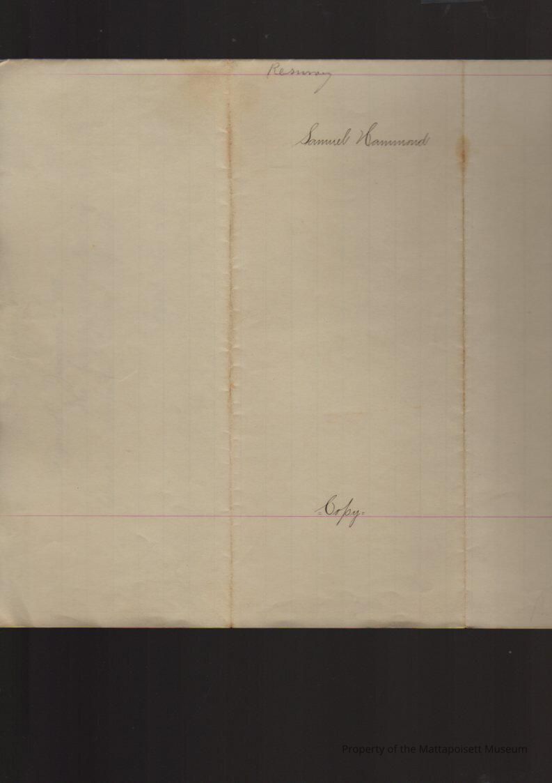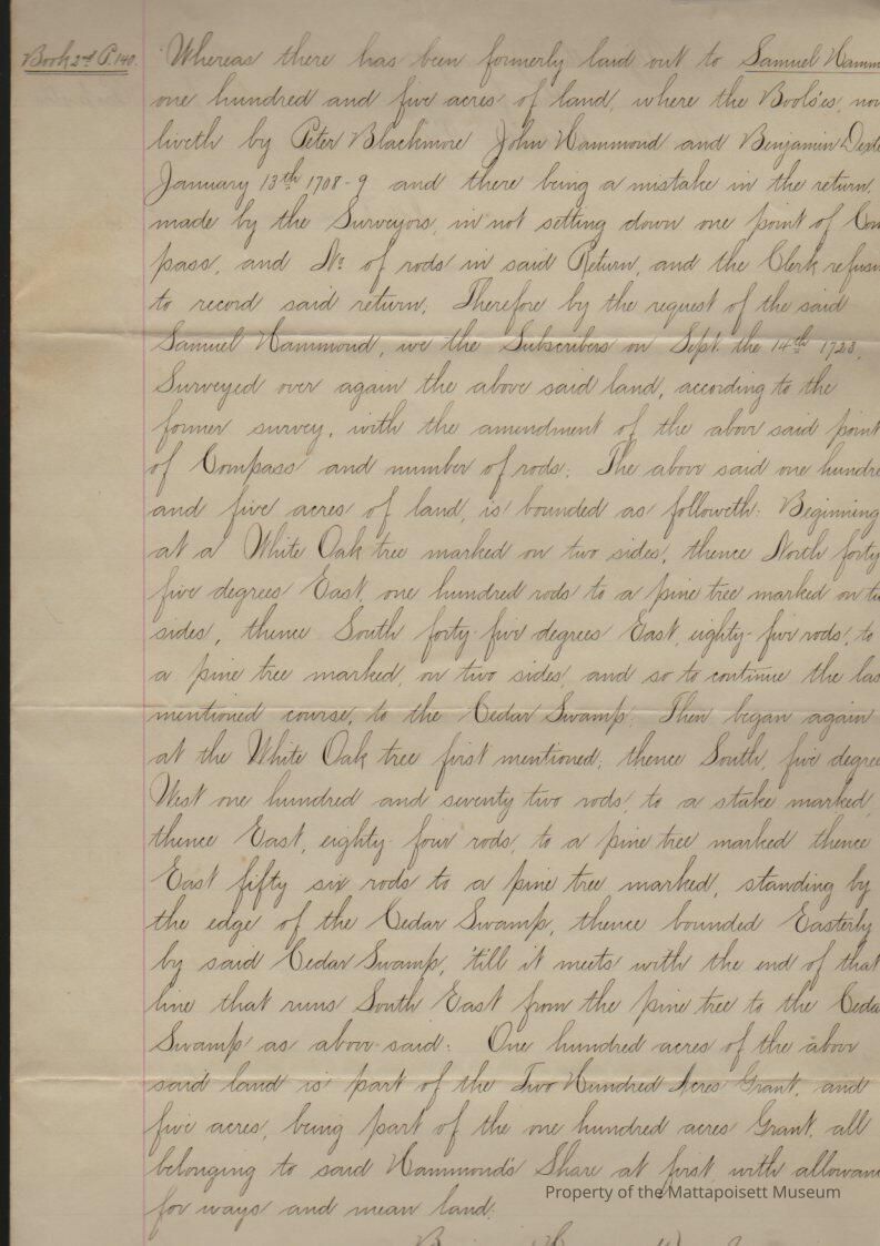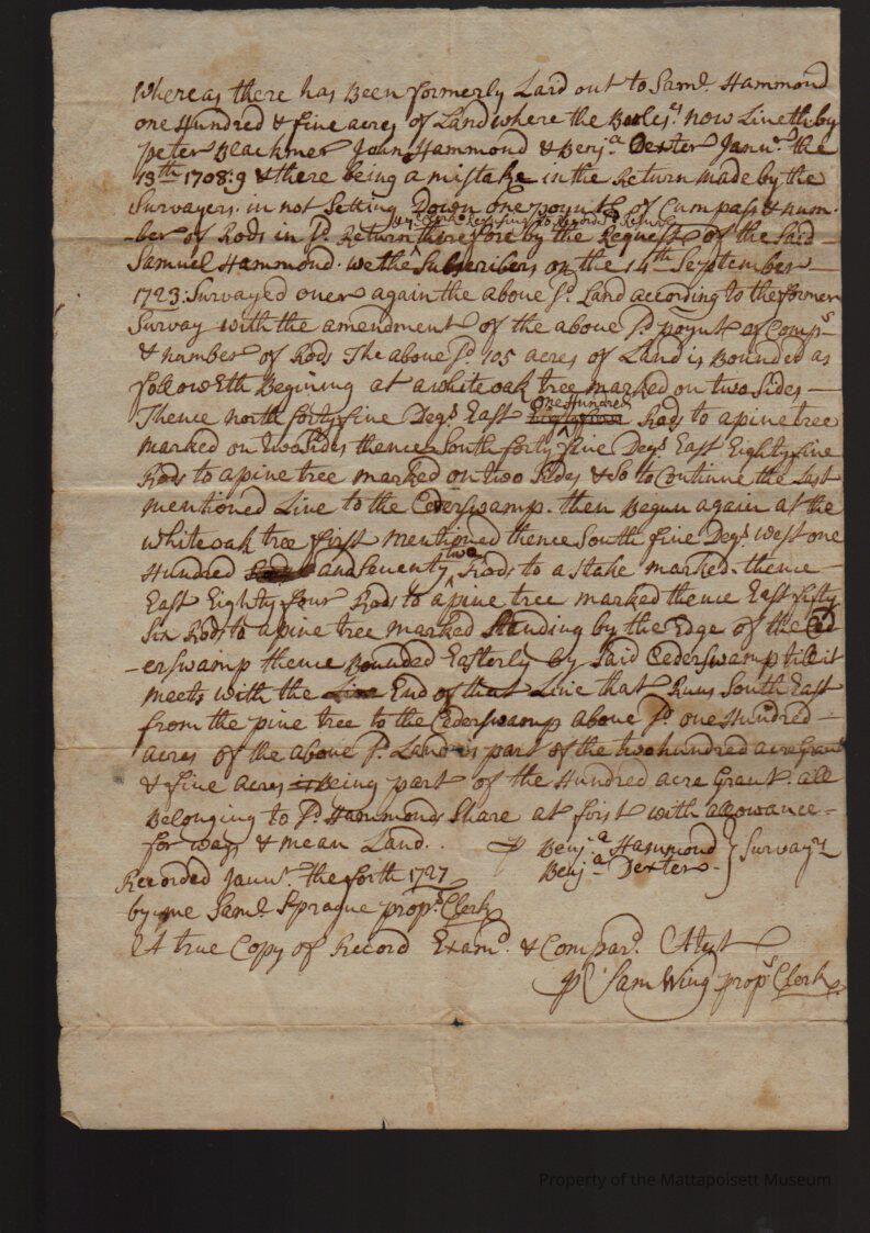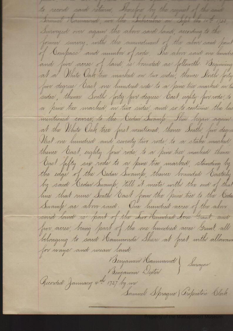 "True copy", Benjamin Hammond and Benjamin Dexter, surveyors. 105 acres laid out to Samuel Hammond where the Bools' now live by Peter Blackmore, John Hammond and Benjamin Dexter, there being a mistake in the return made by the surveyors in setting down one point of compass. Second copy made January 17, 1898, from records "volume 1, page 165".Collection