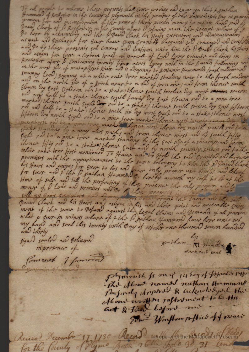 Quitclaim deed, Nathan Hammond to David Clark, 25 acres swampy land. Recorded December 17, 1730, book 26, folio 30-31.Collection