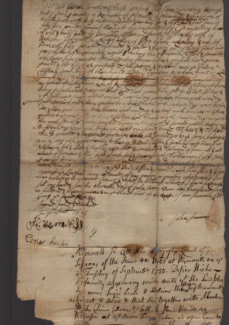 Quitclaim deed, John Jenney (?) to Benjamin Clifton and Sarah Clifton. Recorded, book 26, folio 69.Collection