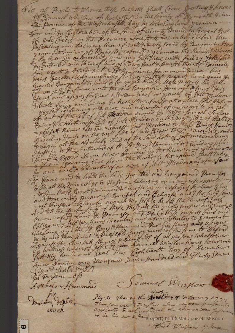 Quitclaim deed, Samuel Winslow (yeoman) to Benjamin Hammond Jr. (yeoman), 1 1/4 acre of salt meadow and dwelling house on the west side of Mattepoysett River. Recorded March 16, 1737, book 31, folio 210.Collection