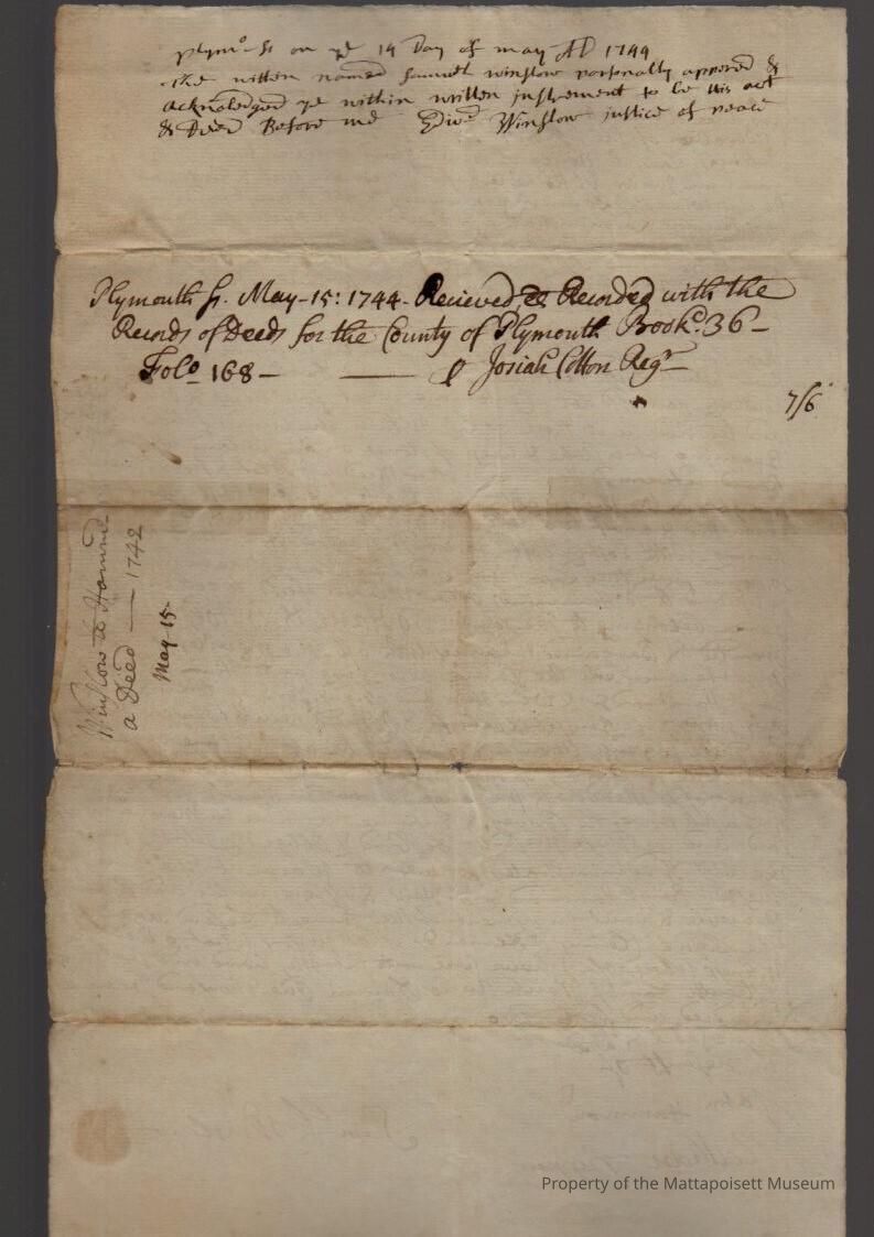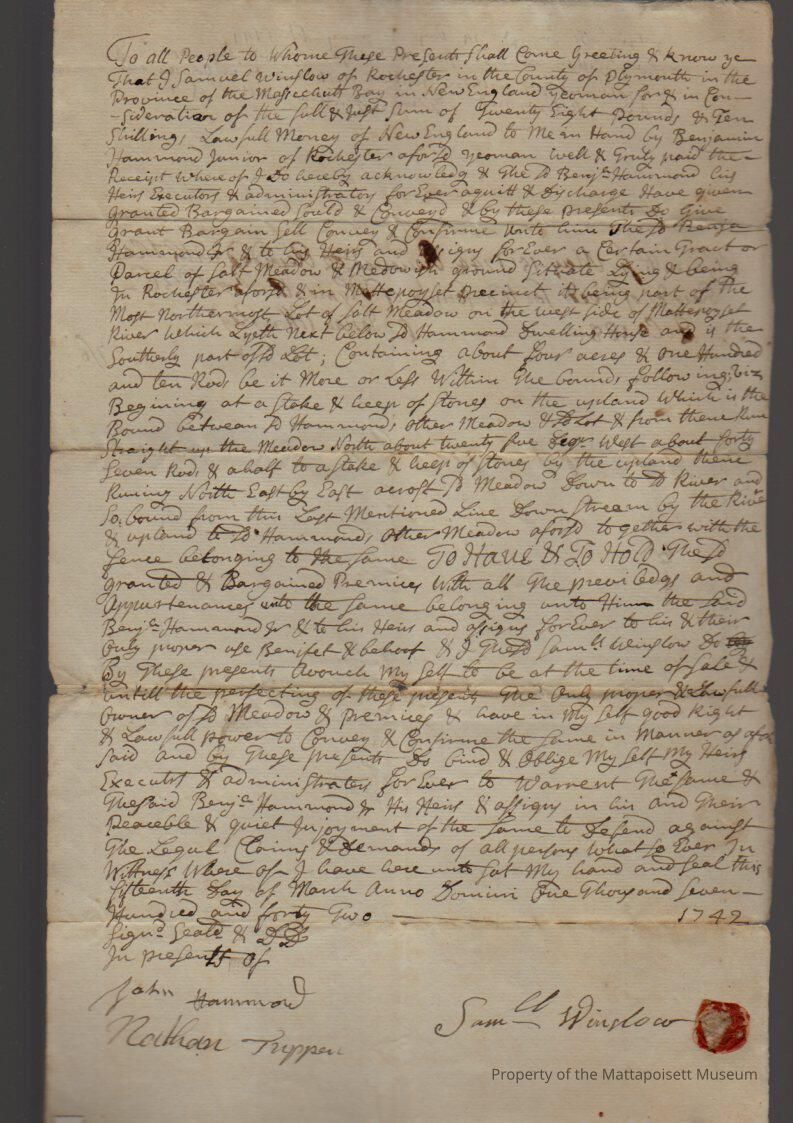 Quitclaim deed, Samuel Winslow (yeoman) to Benjamin Hammond Jr.(yeoman), salt meadow & meadow ground in Mattepoyset precinct, the most northwest lot of salt meadow on the west side of Mattepoyset River. Recorded May 15, 1744, book 36, folio 168.Collection