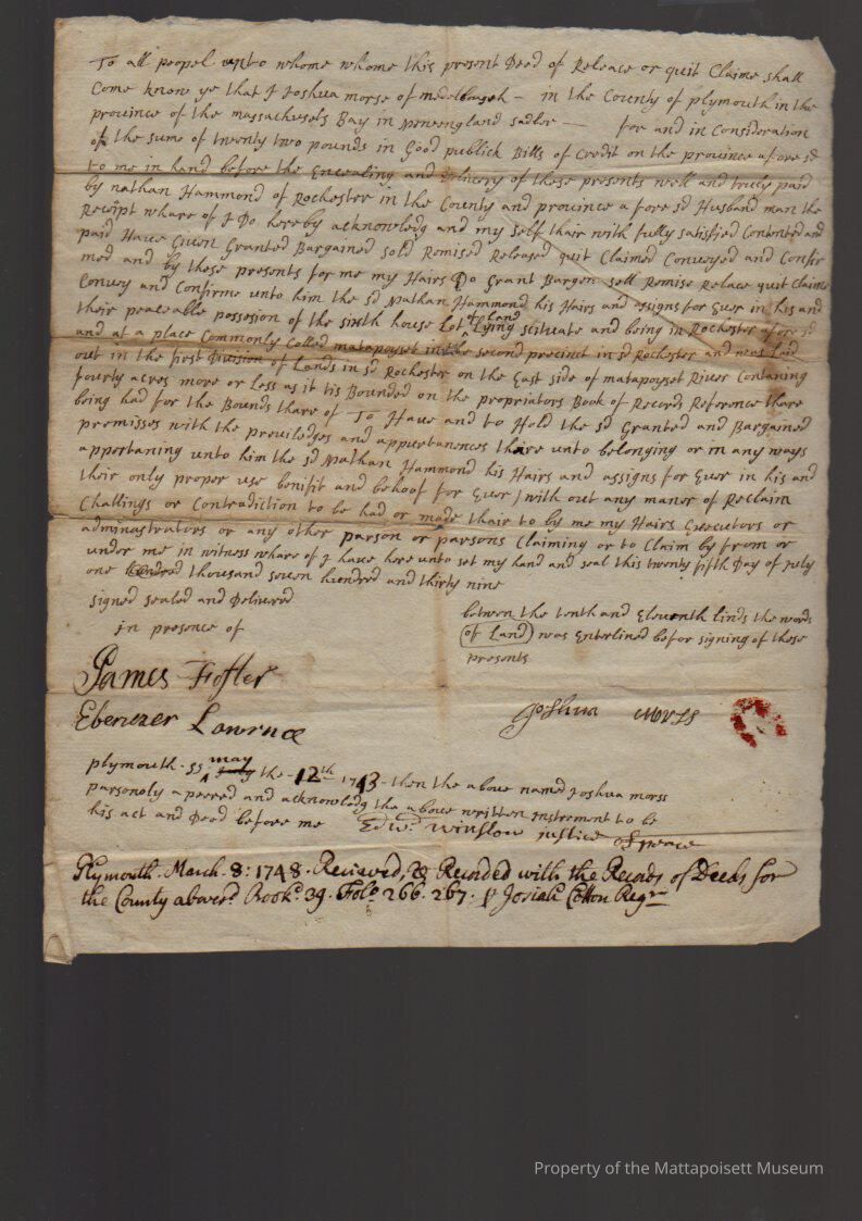 Quitclaim deed, Joshua Morse to Nathan Hammond (husbandman). Recorded March 8, 1748, book 39, folio 266-267.Collection