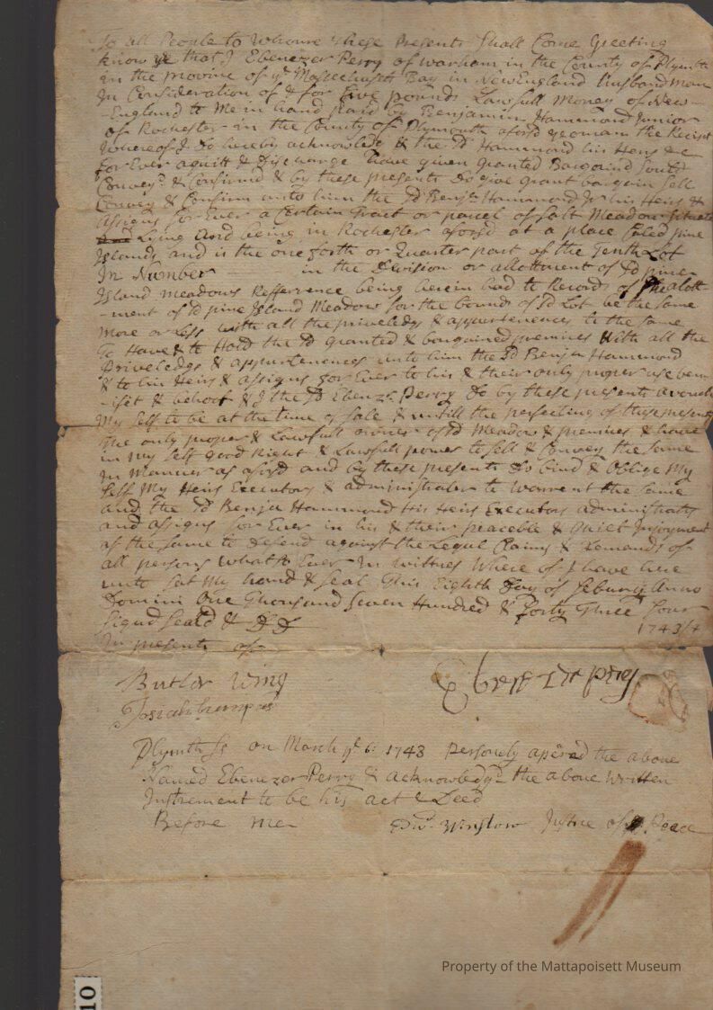 Quitclaim deed, Ebenezer Perry (husbandman) to Benjamin Hammond Jr. (yeoman), quarter part of the tenth lot, Pine Islands meadows.Collection