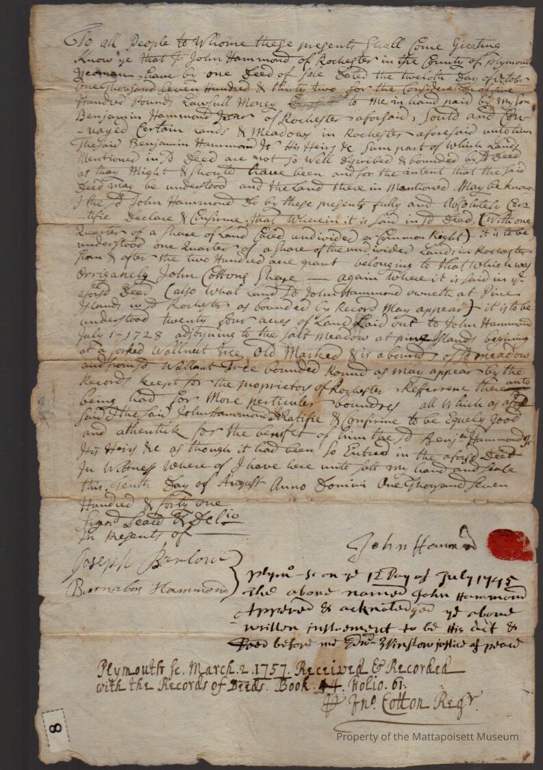 Quitclaim deed, John Hammond (yeoman) of Rochester to son Benjamin Hammond Jr. Of Rochester, certain lands and meadows for 500 pounds. Recorded March 2, 1757, book 44, folio 61.Collection