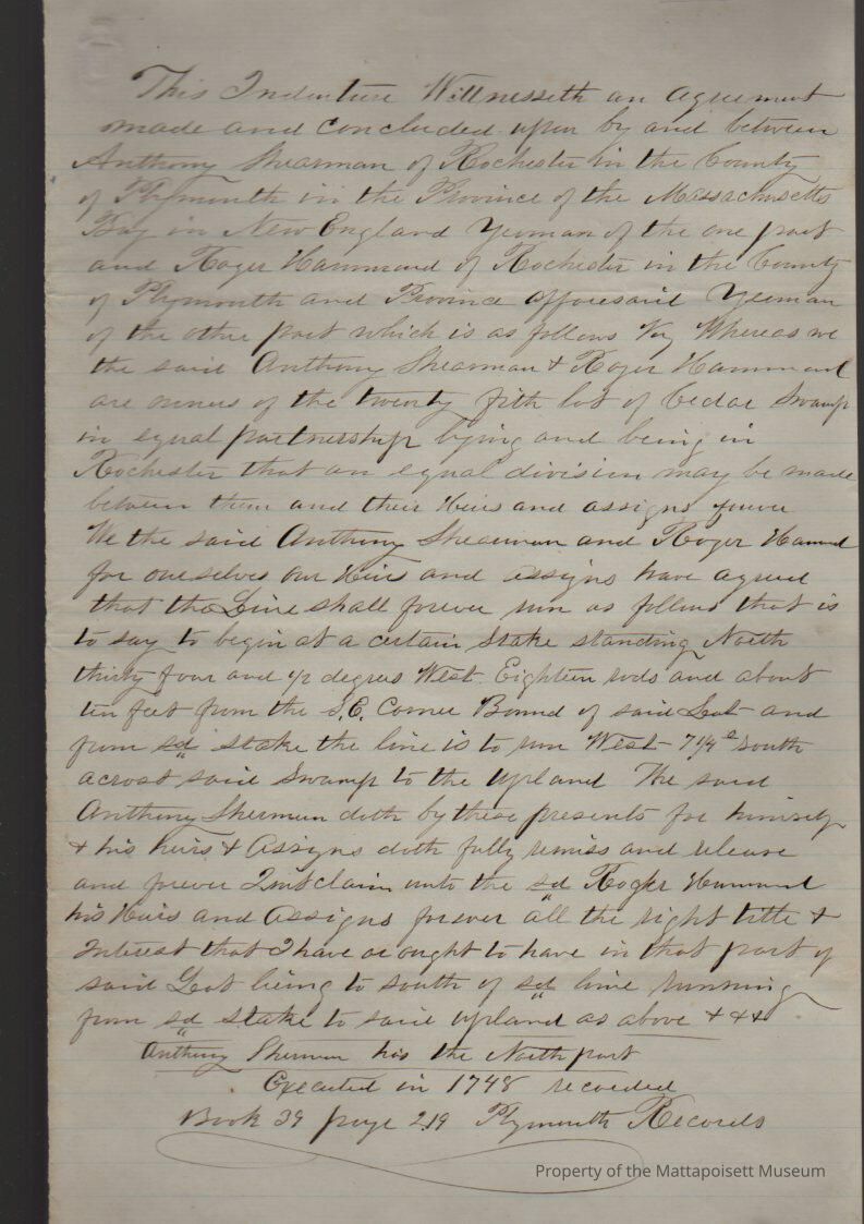 Indenture agreement made and concluded upon by and between Anthony Shearman (yeoman) of Rochester of the one part and Roger Hammond (yeoman) of Rochester of the other part as owners of the twenty fifth lot of Cedar Swamp in equal partnership. Division line, book 29, page 219.Collection