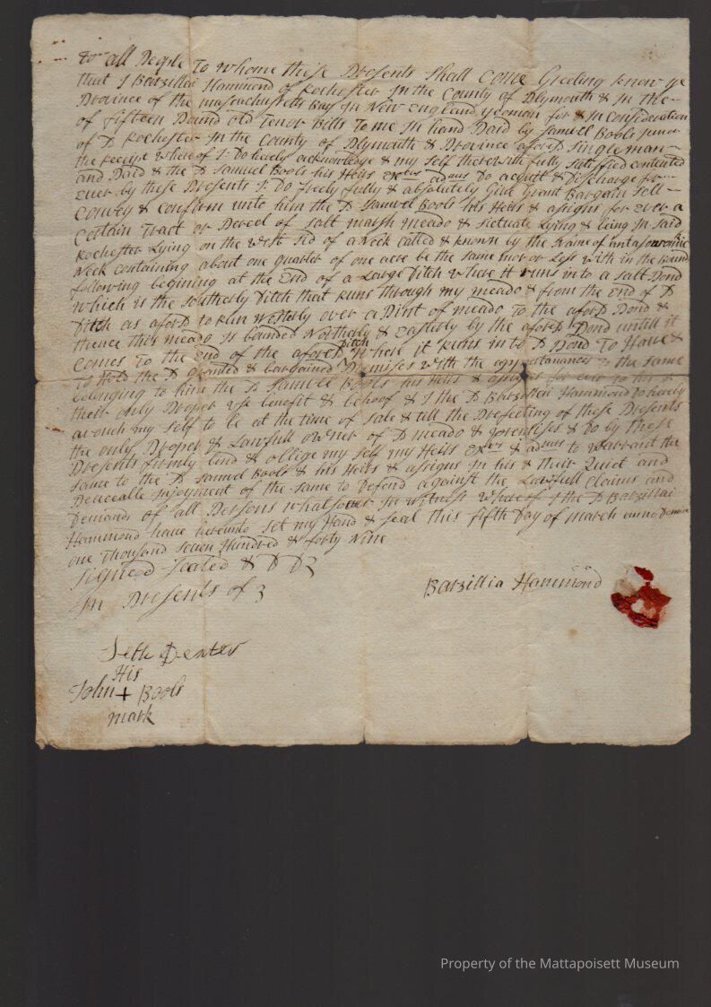 Quitclaim deed, Barzillia Hammond (yeoman) of Rochester to Samuel Bools Jr. (single man?) of Rochester, 1/4 acre of salt marsh on the west side of [Antasouranic] Neck for fifteen pounds.Collection