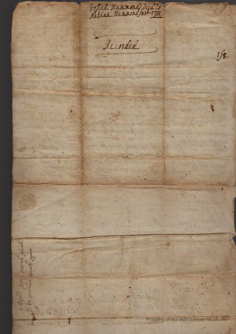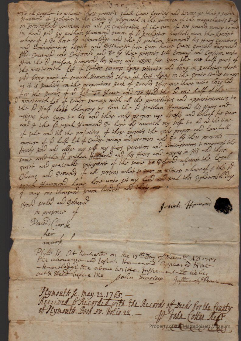 Quitclaim deed, Josiah Hammond (yeoman) of Rochester to Nathan Hammond Jr. (husbandman) of Rochester, 1/2 part of nineteeth lof of Cedar Swamp for six pounds. Recorded May 22, 1765, book 50, folio 22.Collection