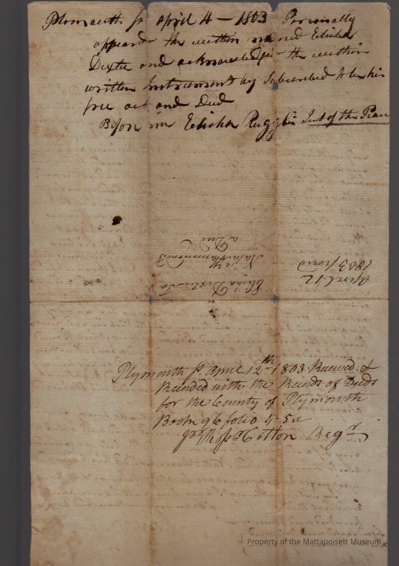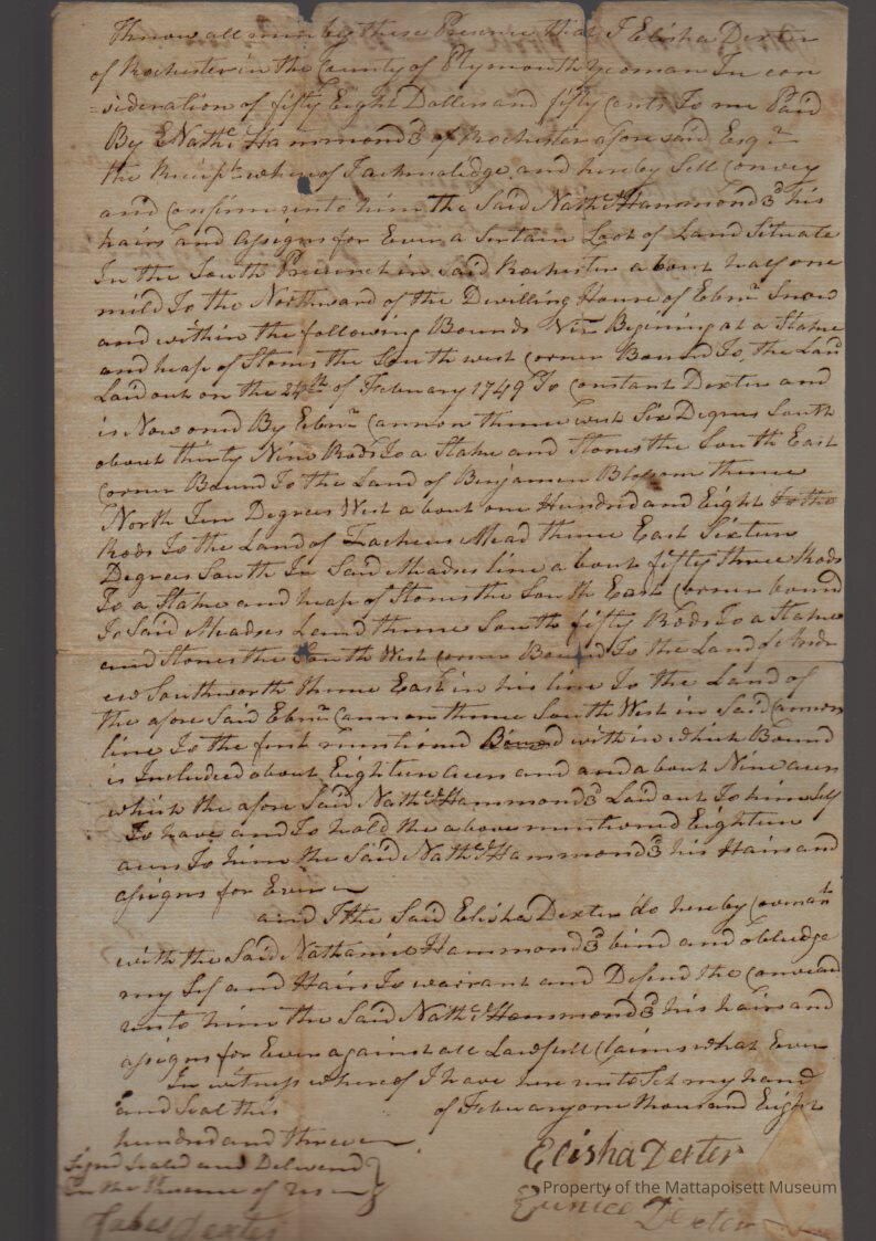 Quitlaim deed, Elisha (yeoman) & Eunice Dexter of Rochester to Nathaniel Hammond (esquire) of Rochester, land in South Parish for $58.50. Recorded April 12th 1803, book 96, folio 4-5.Collection