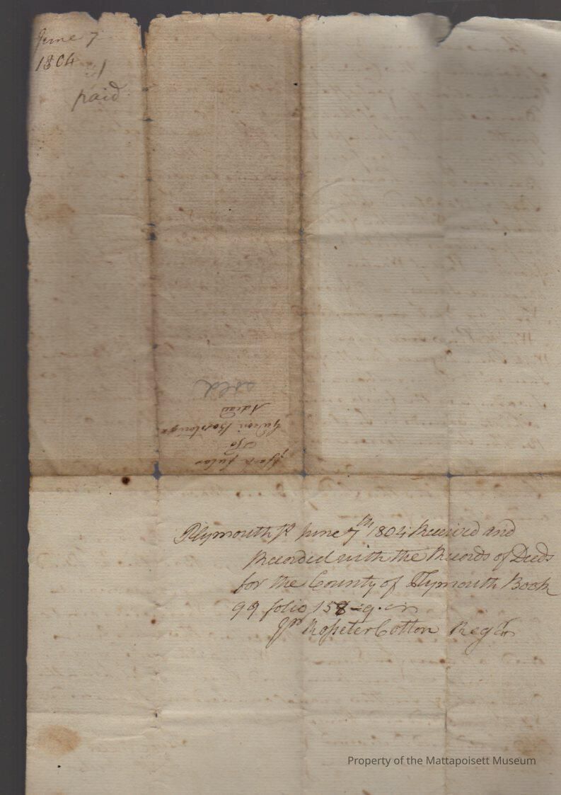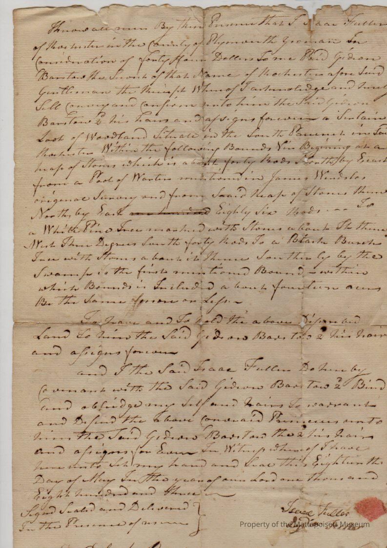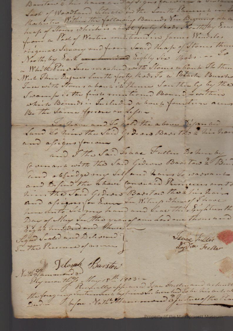 Quitclaim deed, Isaac (yeoman) and Lydia Fuller of Rochester to Gideon Barstow (gentleman) of Rochester, a lot of woodland iin South Parish for $44. Recorded June 7th 1804, book 99, folio 58-59.Collection