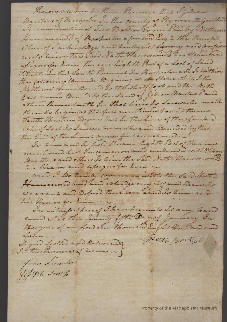 Quitclaim deed, Gideon Barstow (gentleman) of Rochester to Nathaniel Hammond (esquire) of Rochester, 1/8 part of land in South Precinct for $2.Collection