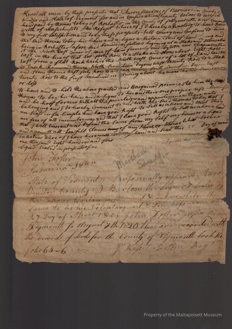 Quitclaim deed, Aaron Barlow of Barnard, VT to Thomas Tobey of Rochester, land for $20.Collection