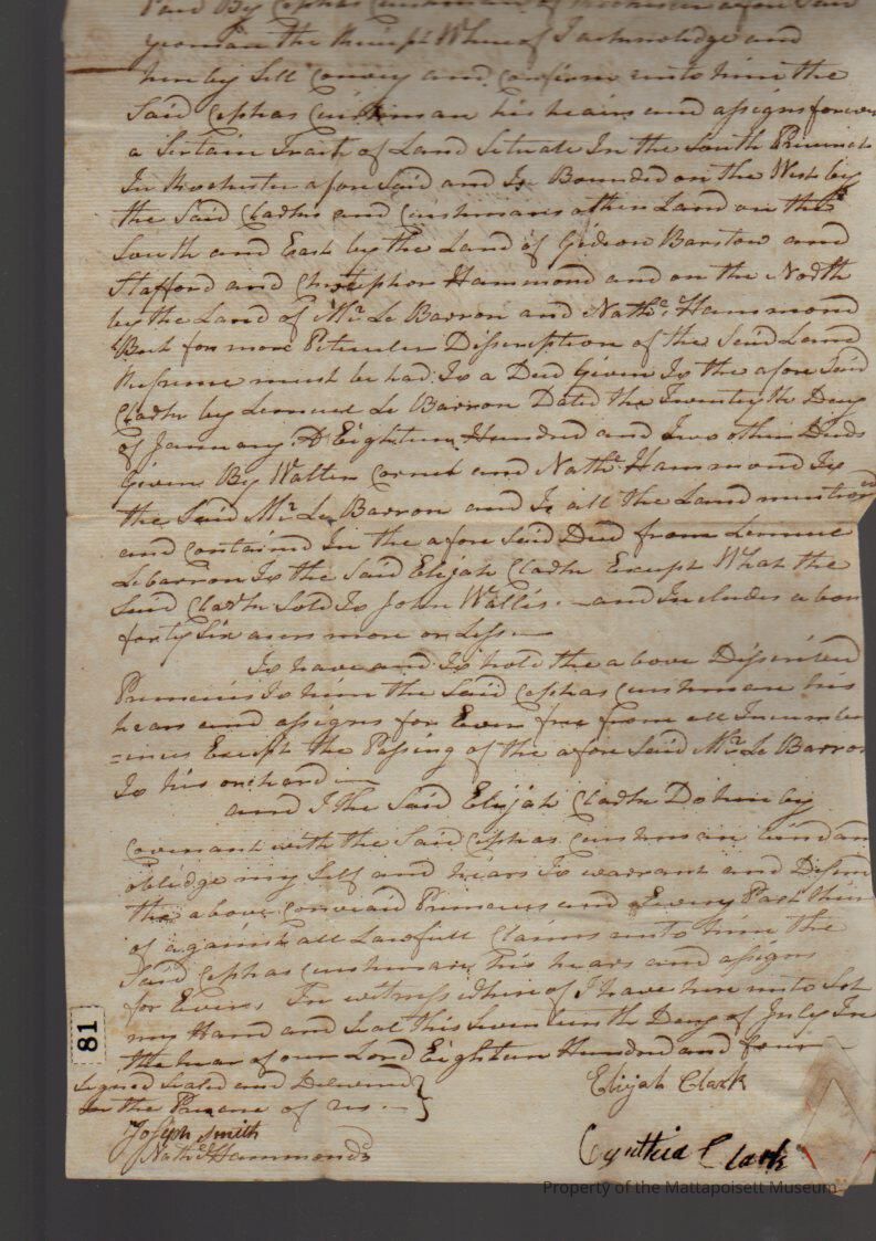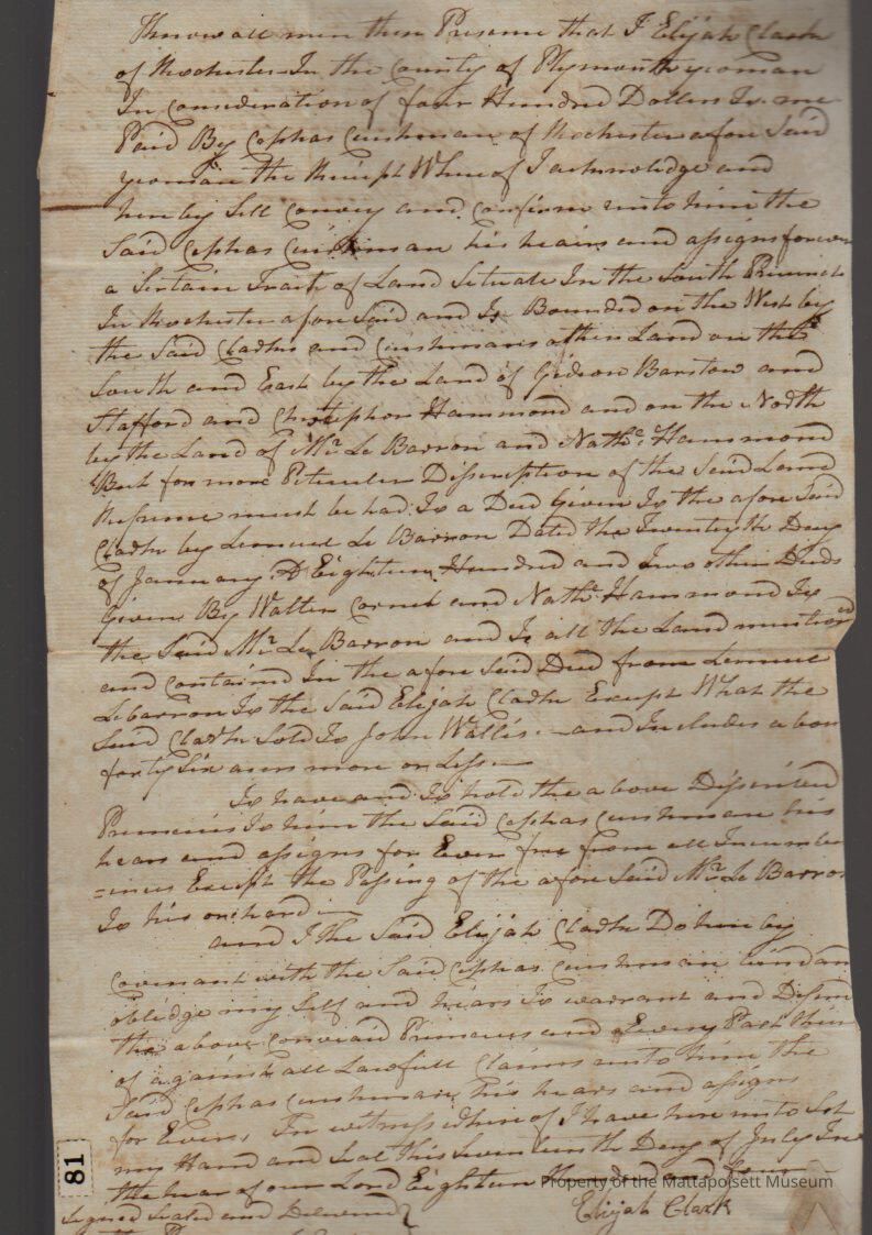 Quitclaim deed, Elijah (yeoman) and Cynthia Clark of Rochester to [Coppas] Cushman (yeoman) of Rochester, land in the south precinct for $400. Recorded August 16th 1804, book 99, folio 218.Collection