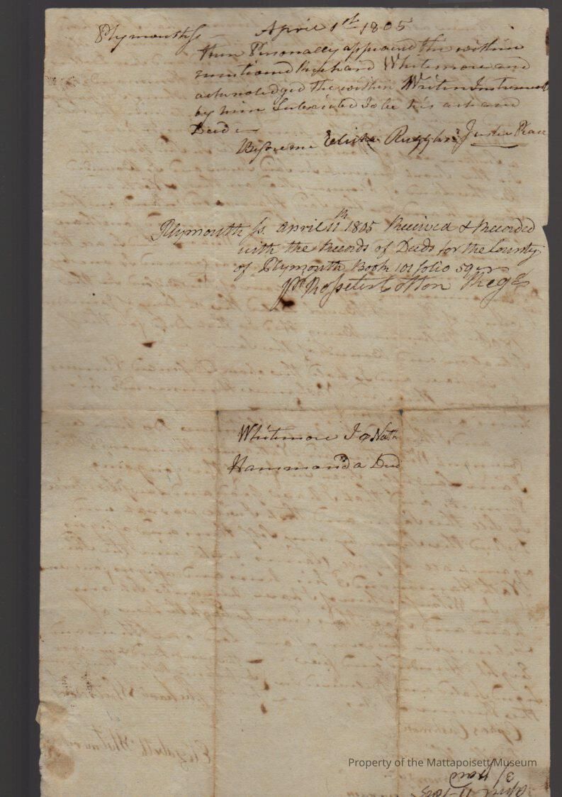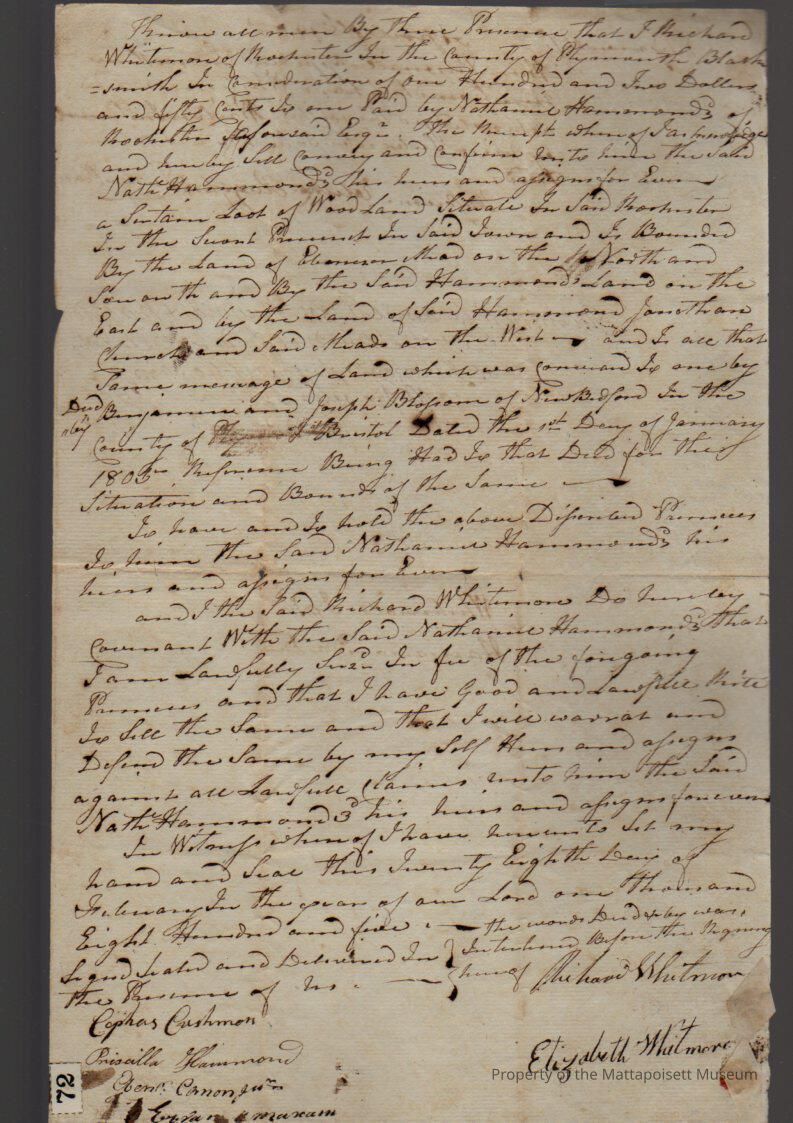 Quitclaim deed, Richard (blacksmith) and Elizabeth Whitman of Rochester to Nathaniel Hammond 3rd (esquire) of Rochester, woodland in the south precinct for $102.50. Recorded April 11th 1805, book 101, folio 59.Collection