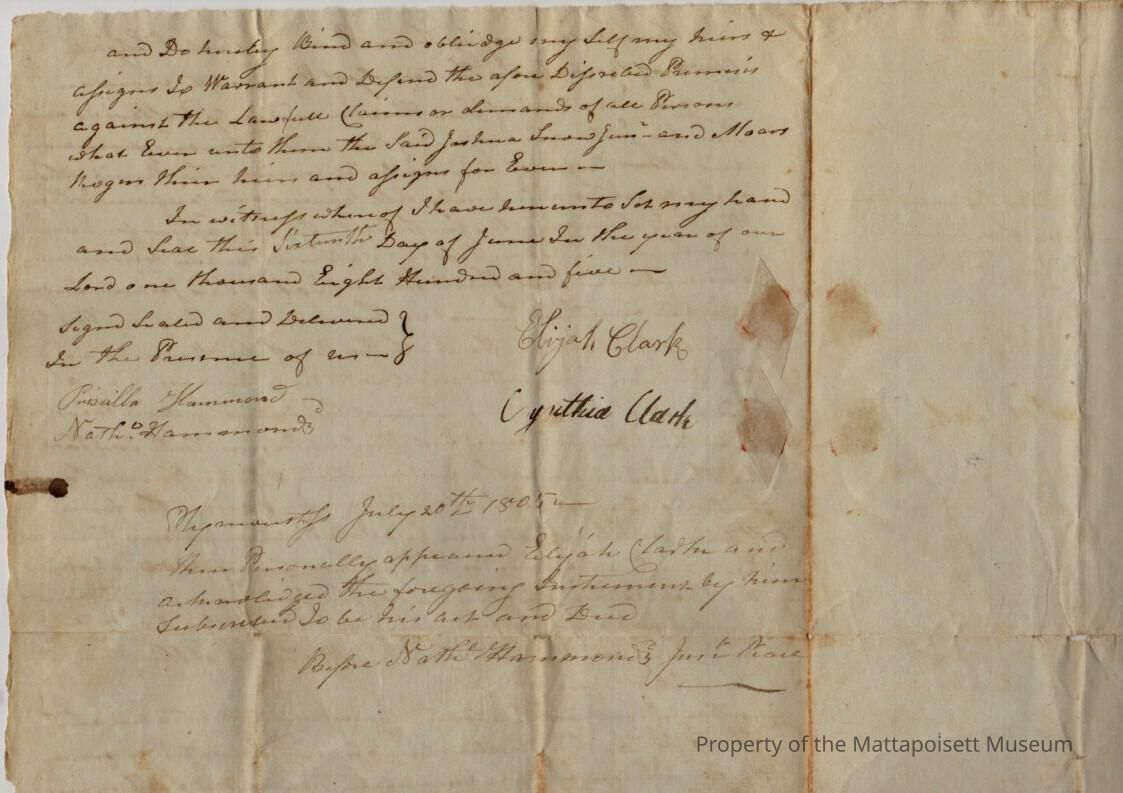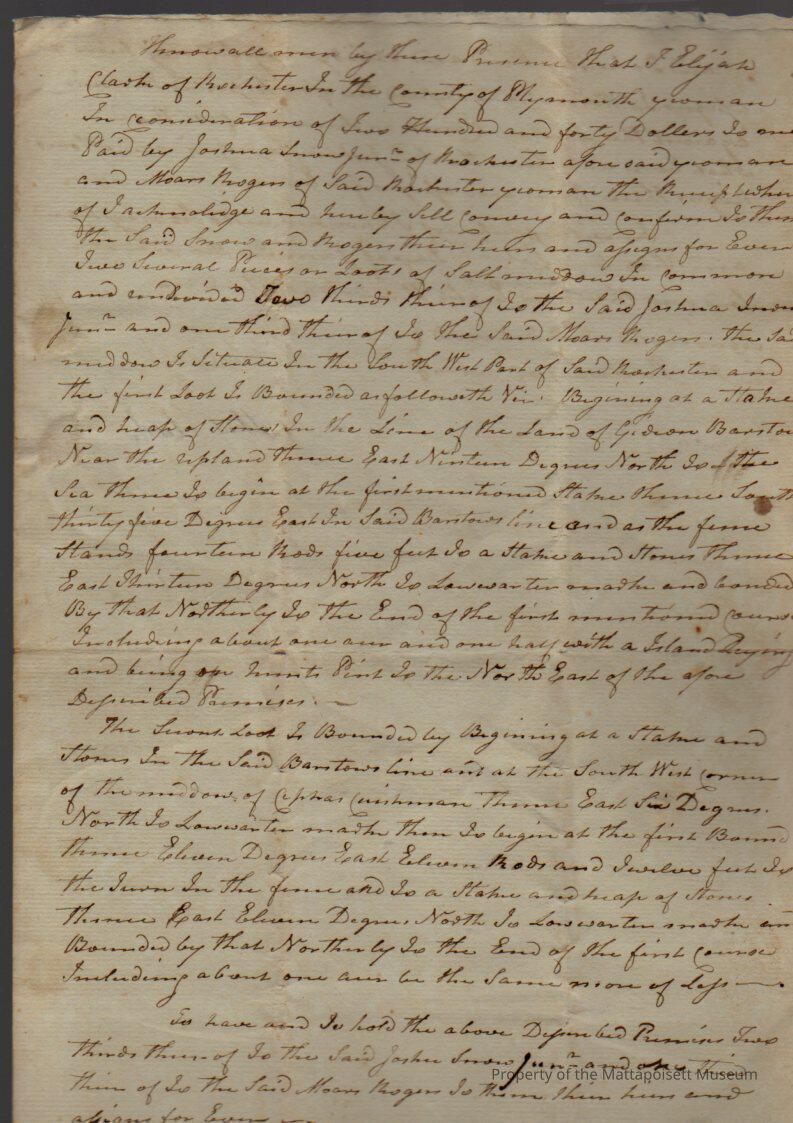 Quitclaim deed, Elijah (yeoman) and Cynthia Clark of Rochester to Joshua Snow Jr. (yeoman) of Rochester and [Moari] Rogers (yeoman) of Rochester salt meadow in common and 2/3 to Joshua Snow and 1/3 Moari Rogers for $240.Collection