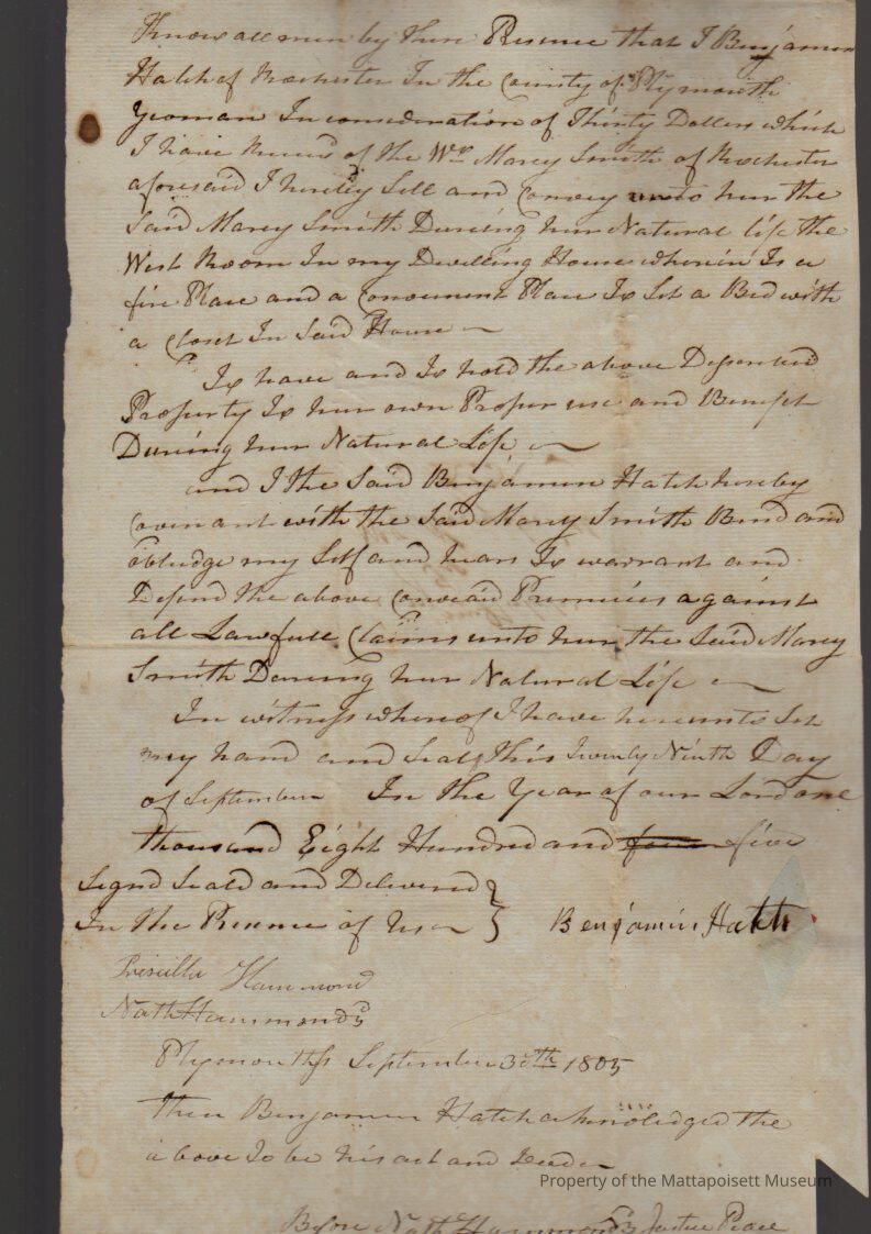 Quitclaim deed, Benjamin Hatch (yeoman) of Rochester to Marcy Smith (widow) of Rochester "during her natural life the west room in my dwelling house wherein is a fireplace and a [conoument place is lot] a bed with a closet in said house" for $30.Collection
