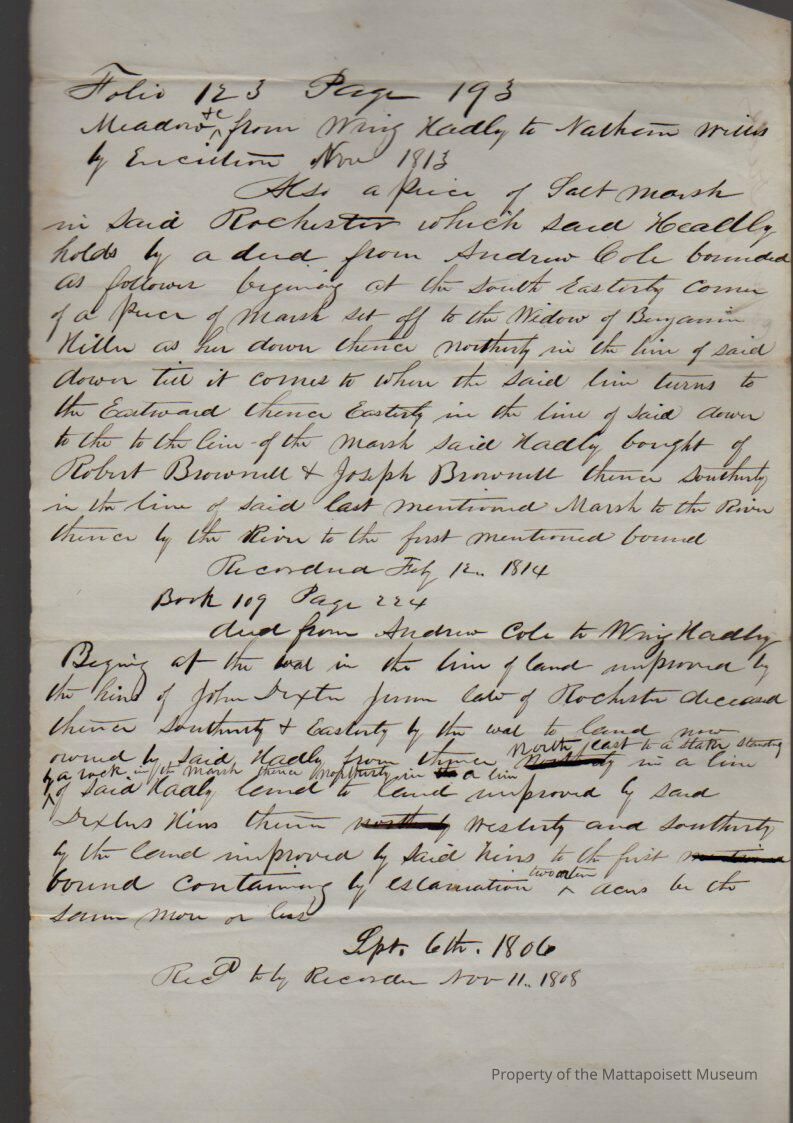 Copy of a deed from Book 123, page 193, meadow from Wing Hadly to Nathan Willis, 11/1813. Copy of deed, book 109, page 224, Andrew Cole to Wing Hadly.Collection