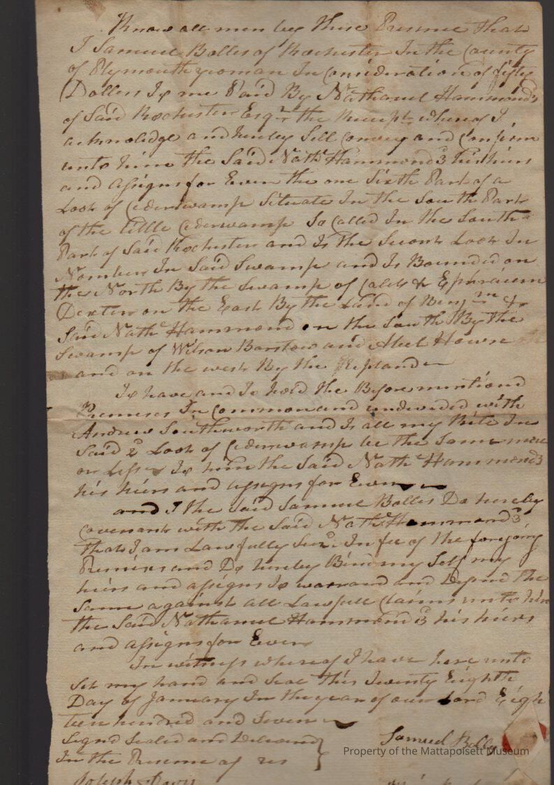 Quitclaim deed, Samuel Bolles (yeoman) of Rochester to Nathaniel Hammond 3rd (esq.) of Rochester, Sixth parcel of lot of Cedar Swamp in south part of little Cedar Swamp, in the south of Rochester for $50.Collection