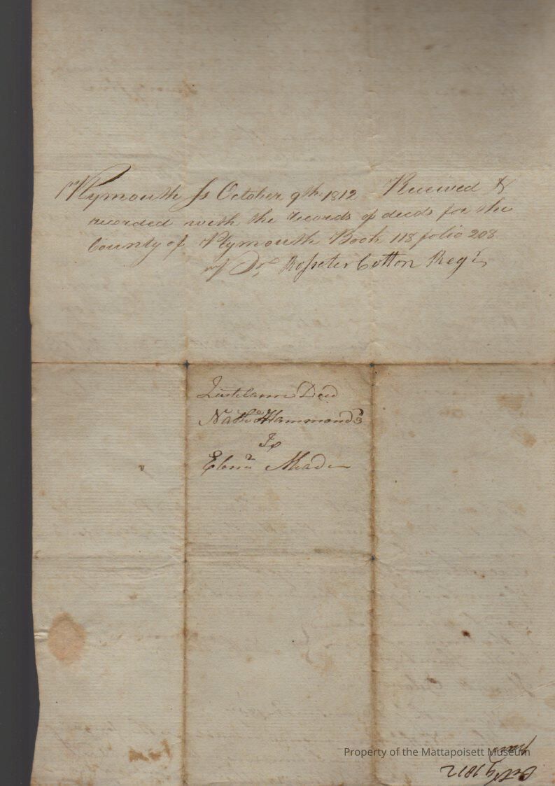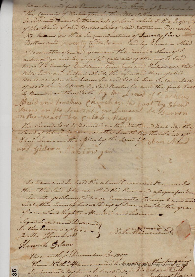 Quitclaim deed, Nathaniel Hammond 3rd (esq.) of Rochester to Ebenezer Mead (yeoman) of Rochester, two lots of woodland for $75.20. Recorded October 9th 1812, book 118, folio 203.Collection