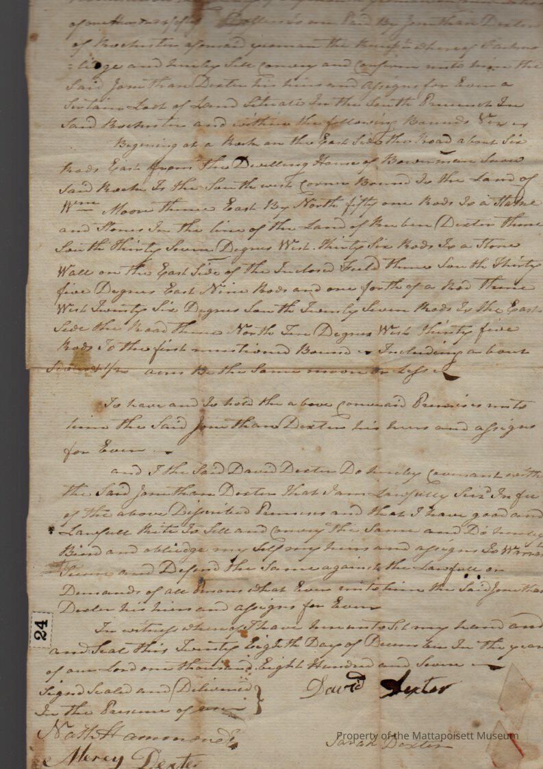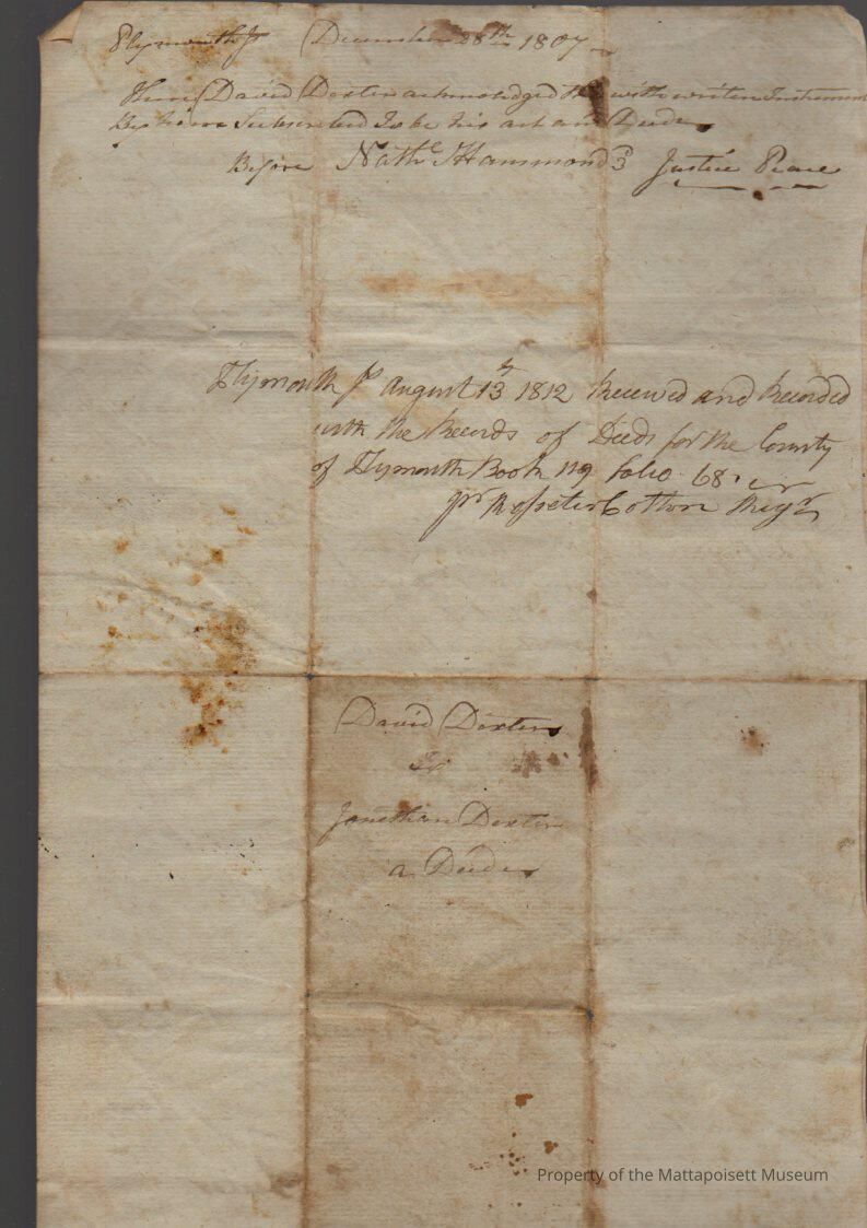 Quitclaim deed, David and Sarah Dexter to Jonathan Dexter (yeoman) of Rochester, land in the south precinct for $250. Recorded August 13th 1812, book 119, folio 68.Collection
