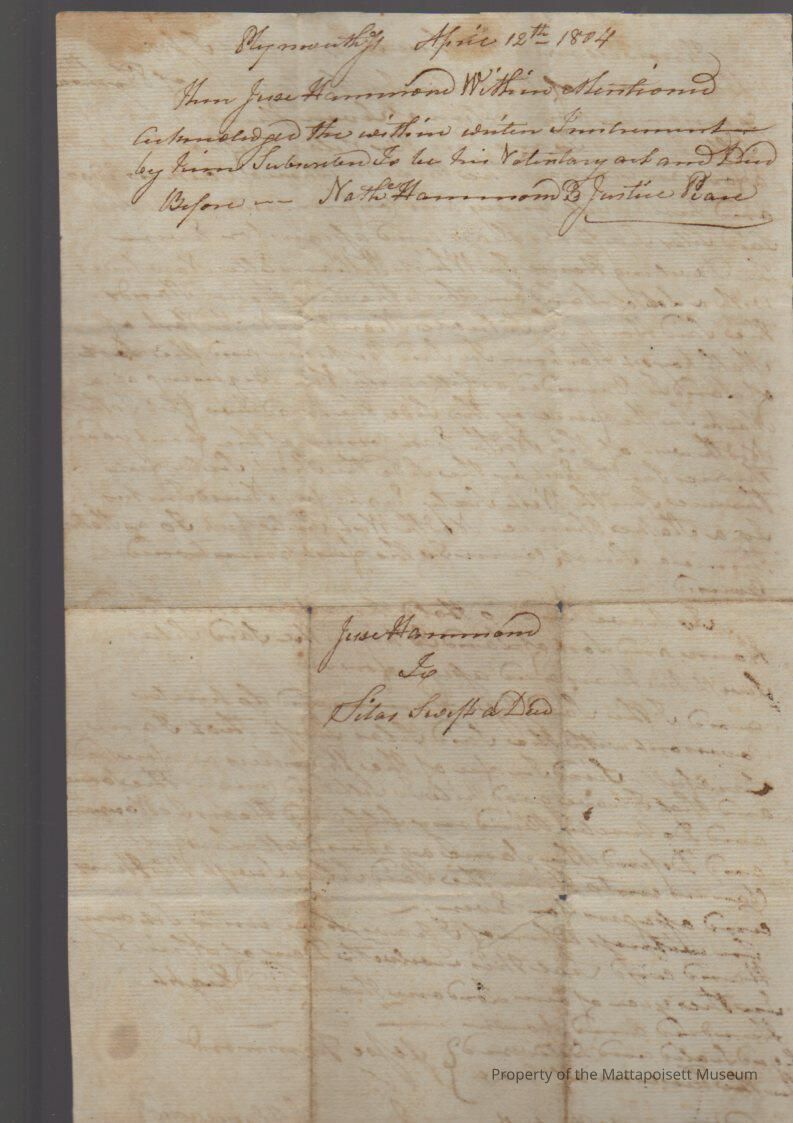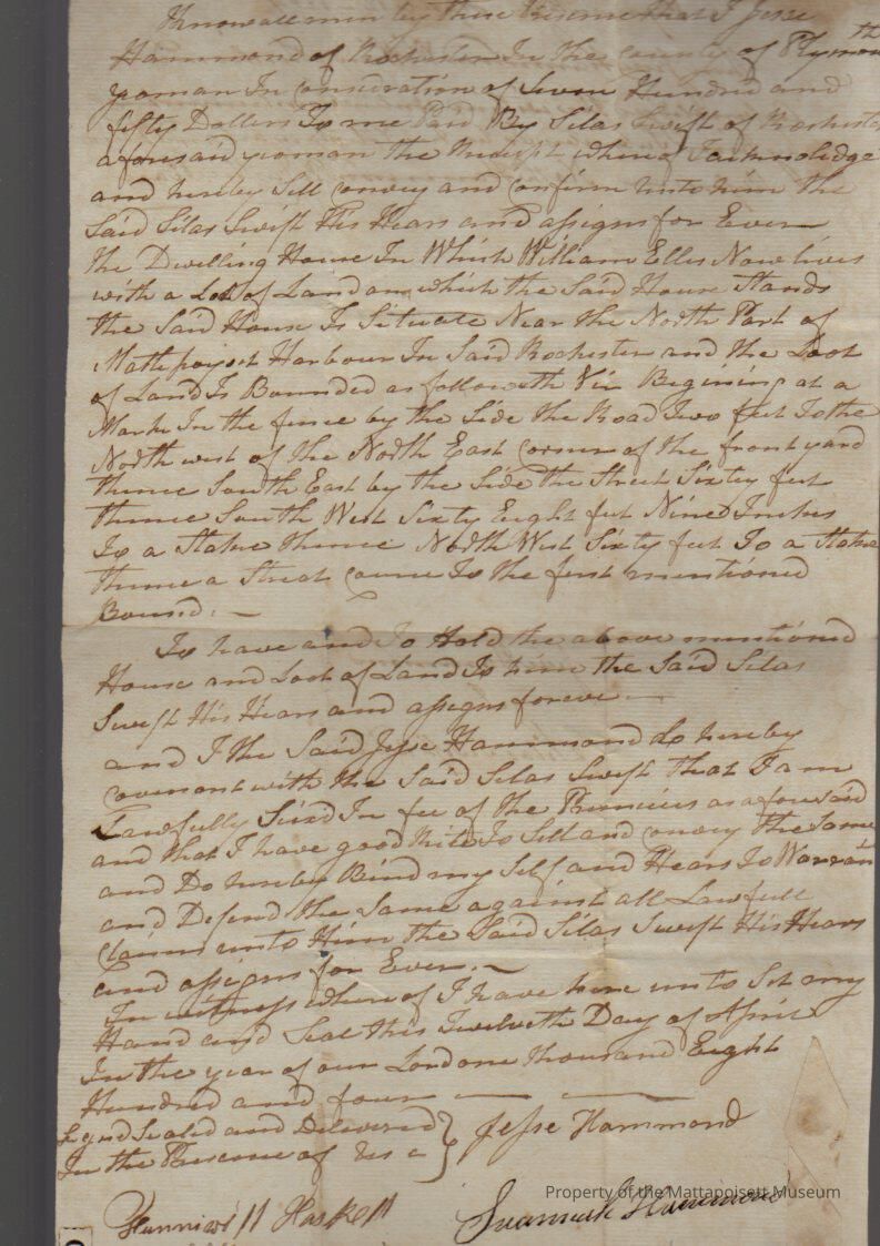 Quitclaim deed, Jesse (yeoman) and Susannah Hammond of Rochester to Silas Swift (yeoman) of Rochester, dwelling house (where William Ellis lives) and lot of land situated near the north part of Mattaposit Harbour for $750.Collection
