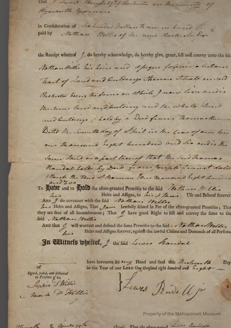 Quitclaim deed, Lewis Randall (yeoman) of Rochester to Nathan Willis (esquire) of Rochester, farm land and buildings situated in Rochester for $600.Collection