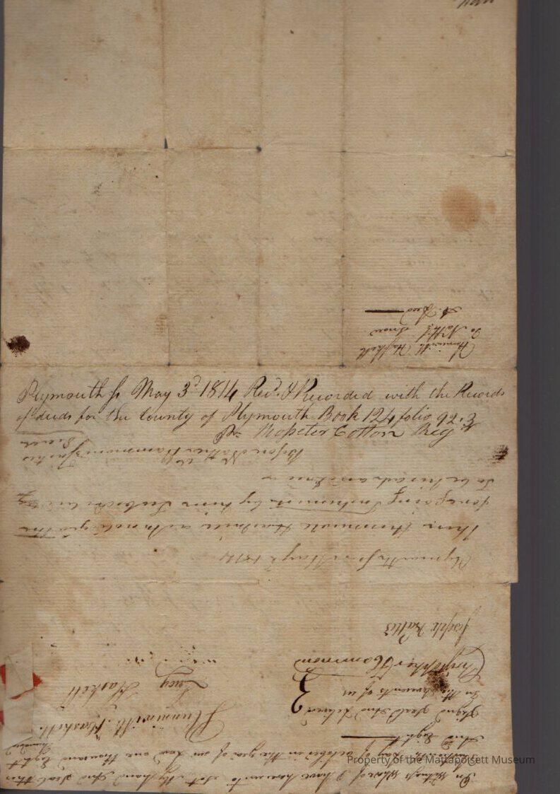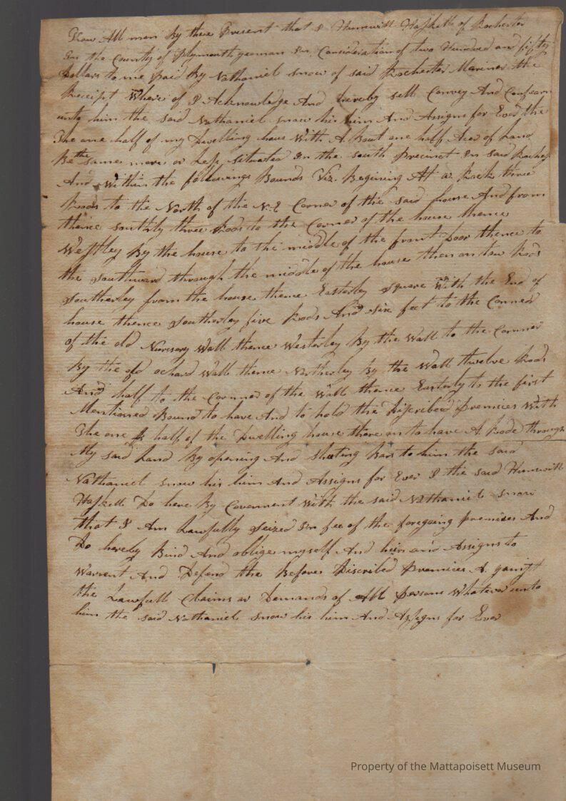 Quitclaim deed, [Hunniwith] (yeoman) and Lucy Haskill of Rochester to Nathaniel Snow (mariner) of Rochester, half of dwelling, with about one half acres in the South Precinct for $250. Recorded May 3rd 1814, book 124, folio 92-93.Collection