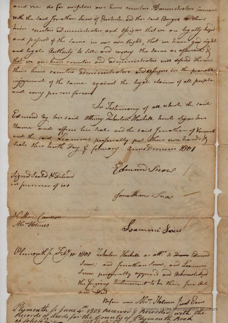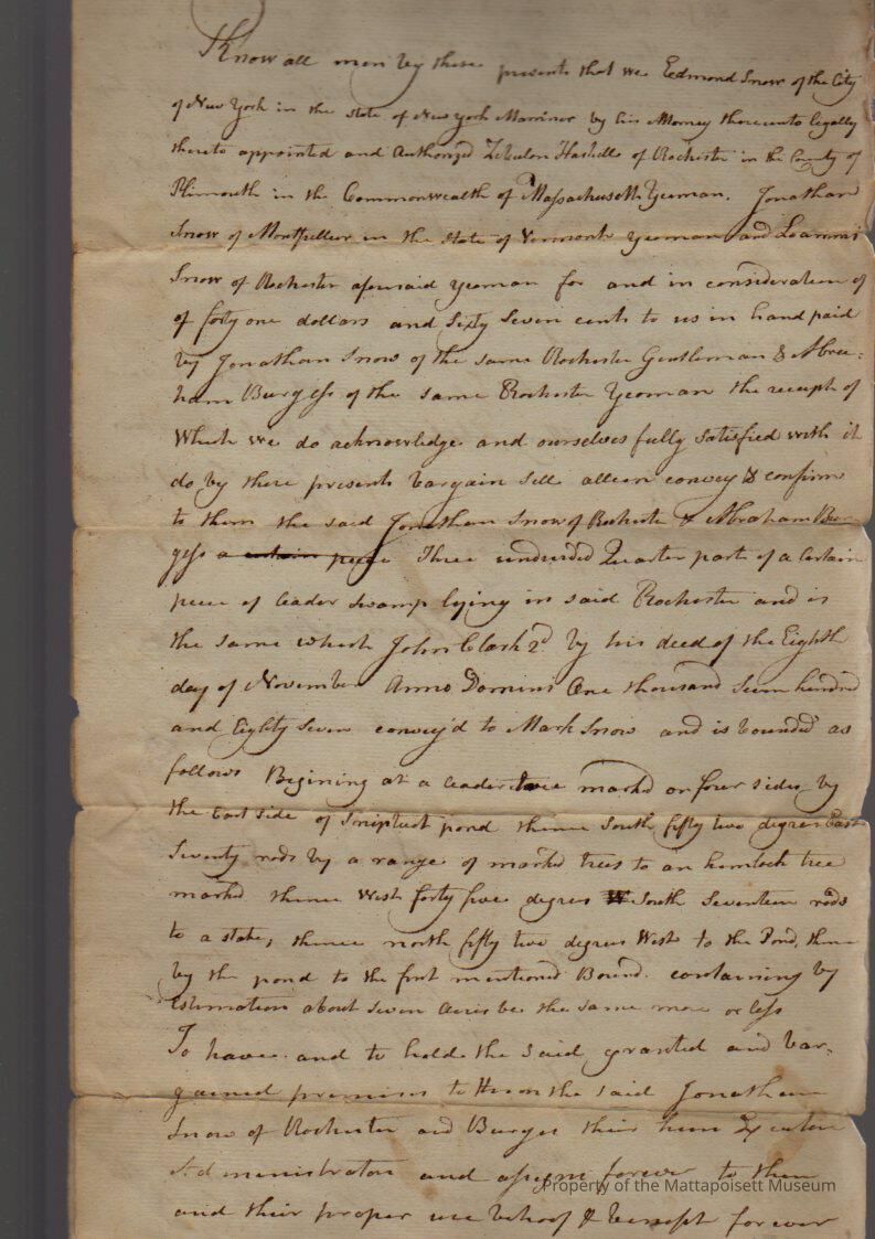 Quitclaim deed, Edmund Snow (mariner) of New York (and others) to Jonathan Snow (gentleman) and Abraham Burger (yeoman) of Rochester, for $41.67, one quarter of a certain Cedar Swamp.Collection