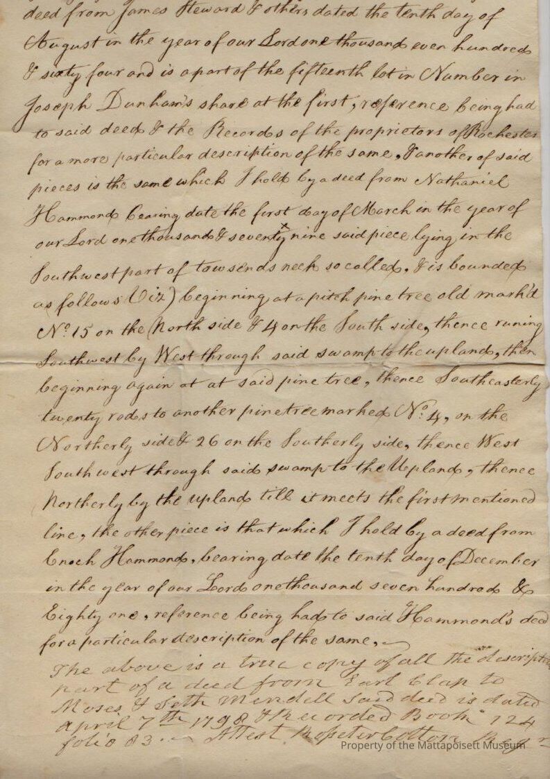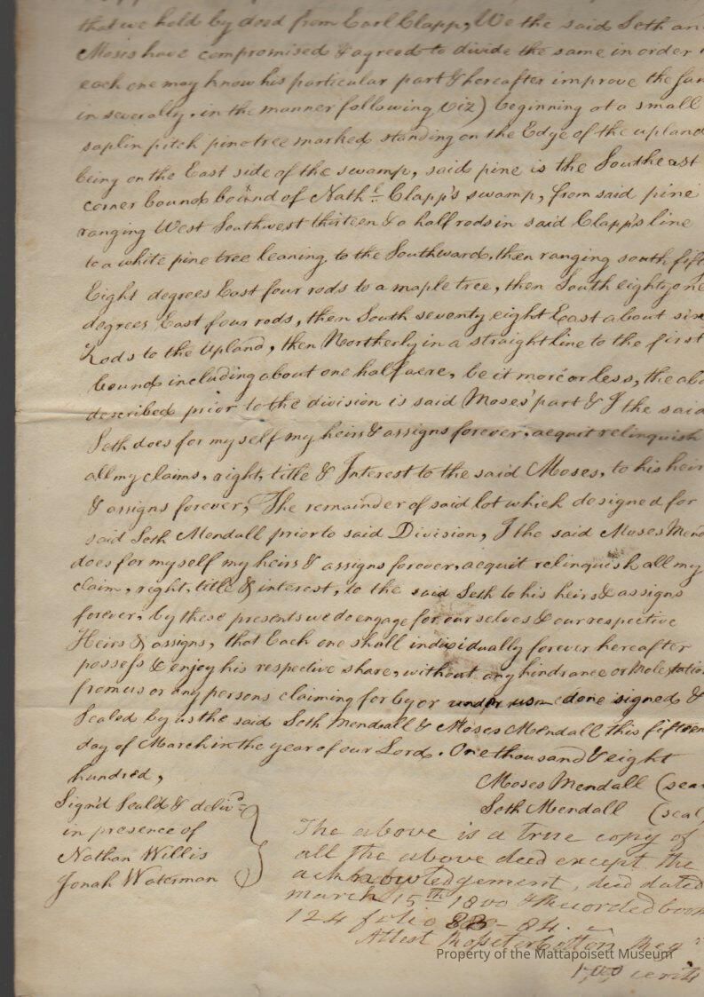 "True copy" of division deed, Moses Mendell and Seth Mendell. Recorded, book 124, folio 83-84.Collection