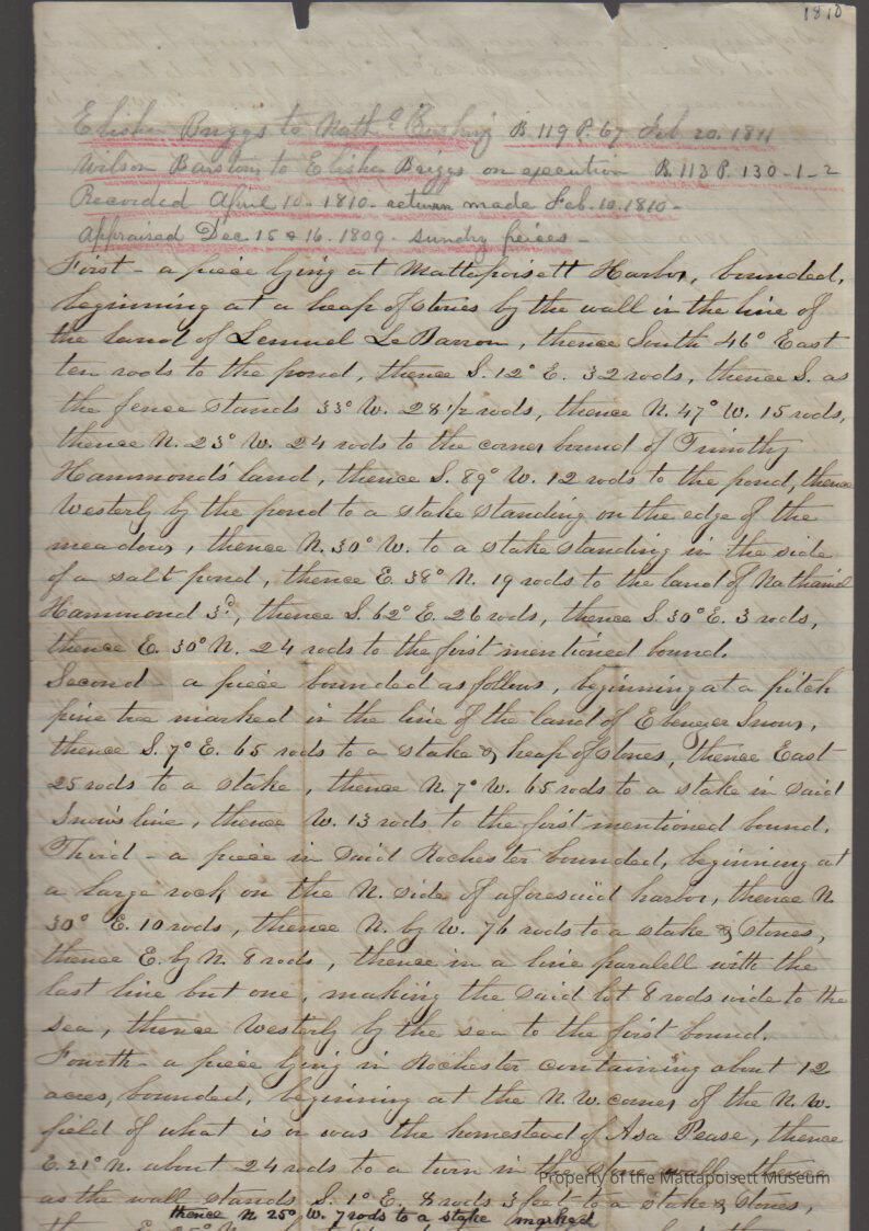 Transcriptions of deeds between Elisha Briggs to Nathaniel Cushing, book 119, page 67; Wilson Barstow to Elisah Briggs, book 113, page 130-132.Collection