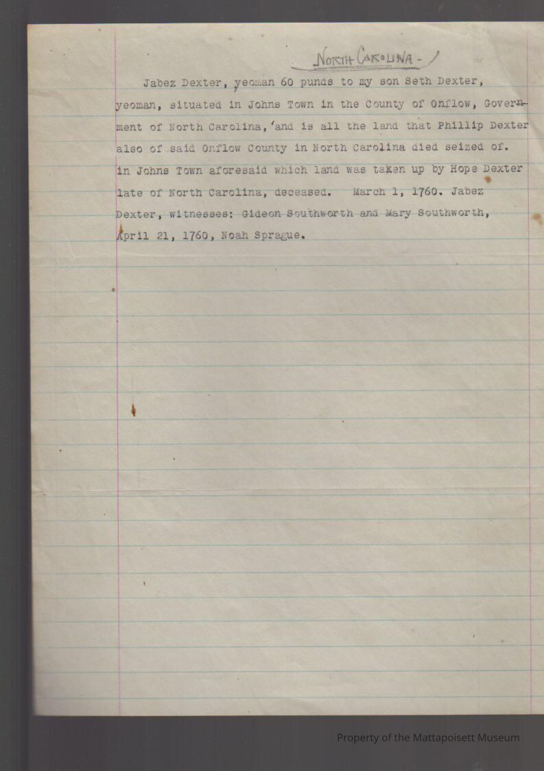 Typed transcript of deed excerpt, Jabez Dexter to son Seth Dexter, March 1, 1760.Collection