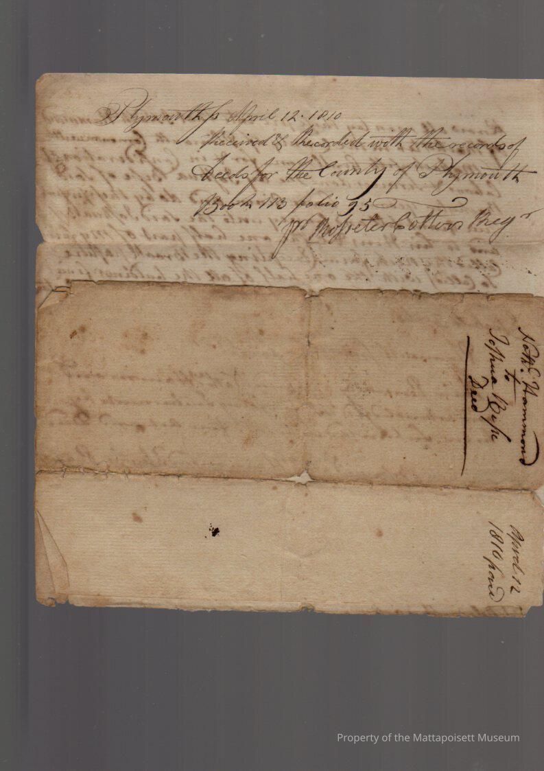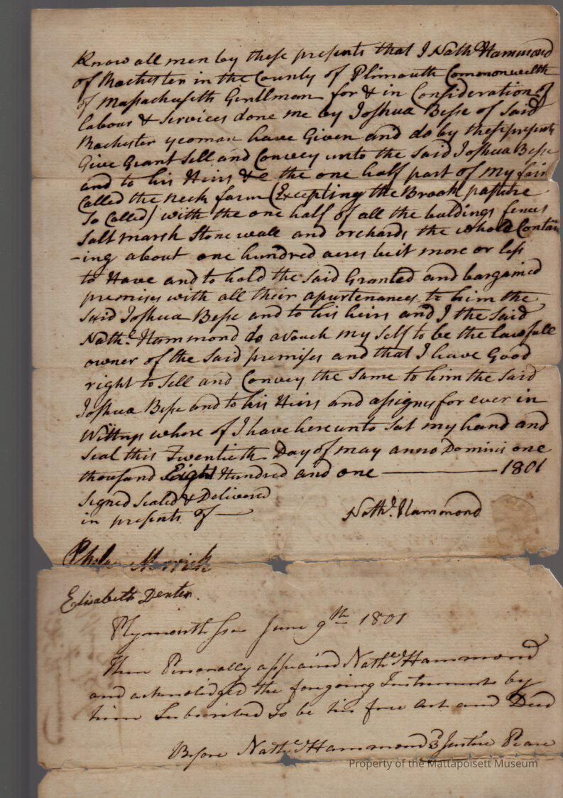Quitclaim deed, Nathaniel Hammond (gentleman) of Rochester to Joshua [Besse] (yeoman) of Rochester, half part of land called the "Neck Farm" (excepting the brook pasture), with one half of all the buildings, fences, salt marsh, stone wall and orchard for labour and services. Recorded April 12,1810, book 113, folio 95.Collection