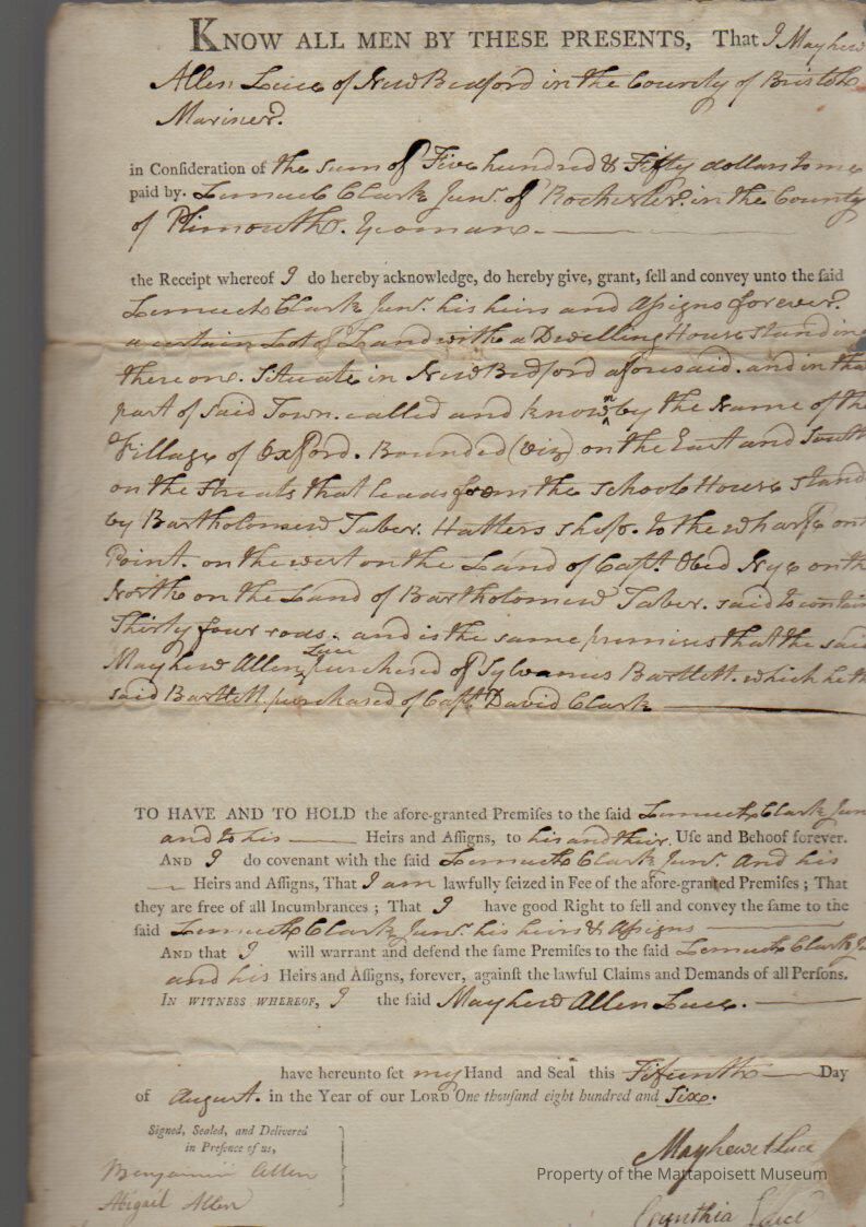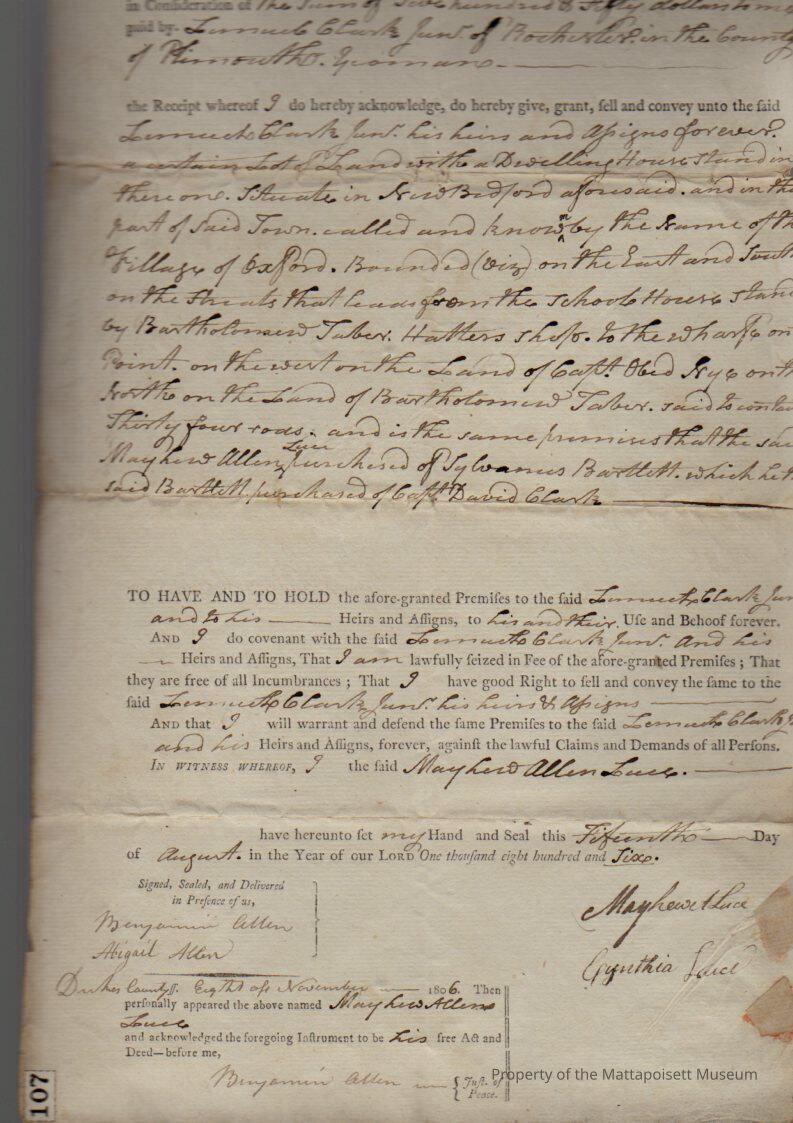 Quitclaim deed, Mayhew and Cynthia Luce of New Bedford to Lemuel Clark Jr. (yeoman) of Rochester, for $550, land and dwelling house in New Bedford. Recorded December 15, 1813, book 96, page 173.Collection