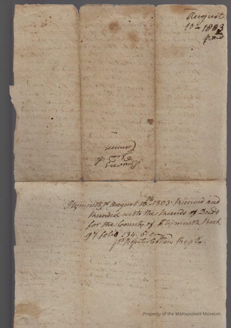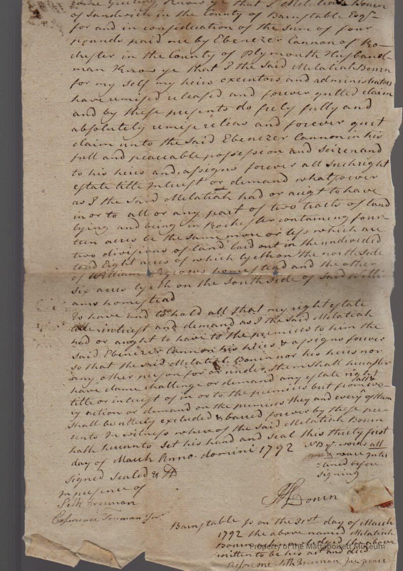 Quitclaim deed, Melatiah Bourne of Sandwich to Ebenezer Cannon of Rochester, two tracts of land, eight acres and six acres for four pounds. Recorded August 10th 1803, book 97, folio 134-135.Collection