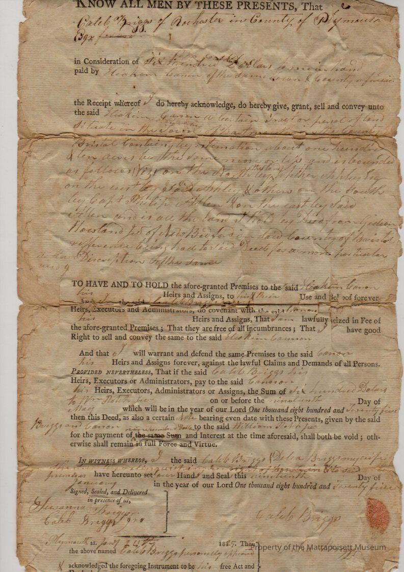 Quitclaim deed, Caleb (esquire) and Debra Briggs of Rochester to Eliaham Cannon, land in Dartmouth of about 110 acres for $600.Collection