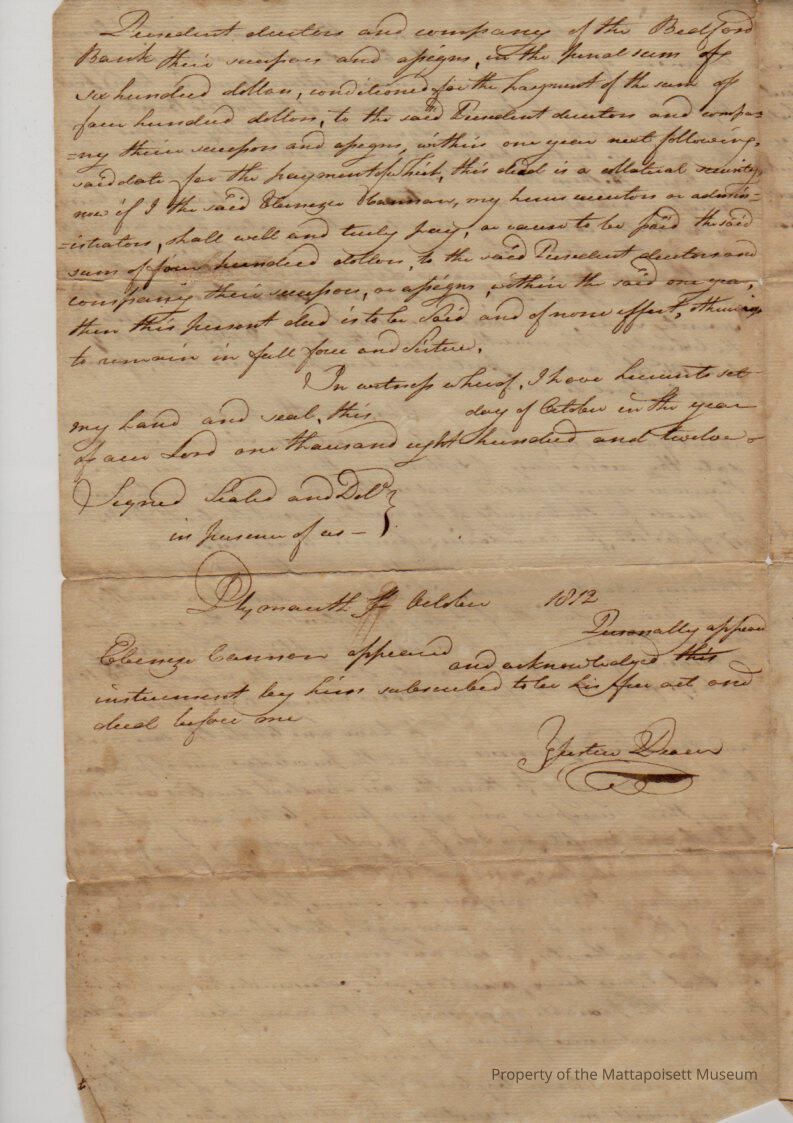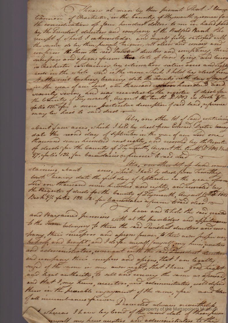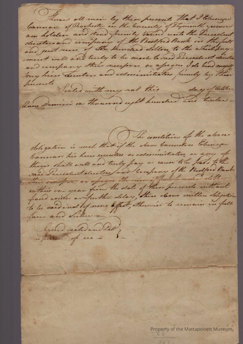 Ebenezer Cannon (yeoman) of Rochester for $400, paid by President, Directors and Company of the Bedford Bank for lots of land, 16 acres and 80 rods, in RochesterCollection
