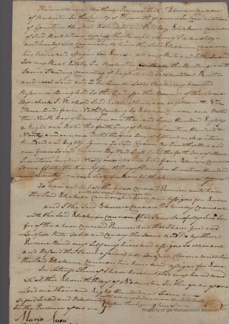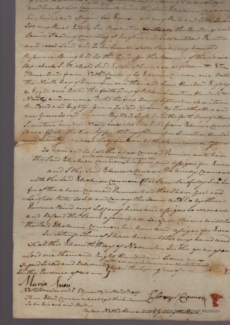Quitclaim deed, Ebenezer Cannon (yeoman) of Rochester to Eliakam Cannon (yeoman) of Rochester, salt meadow and woodland for $1,400.Collection
