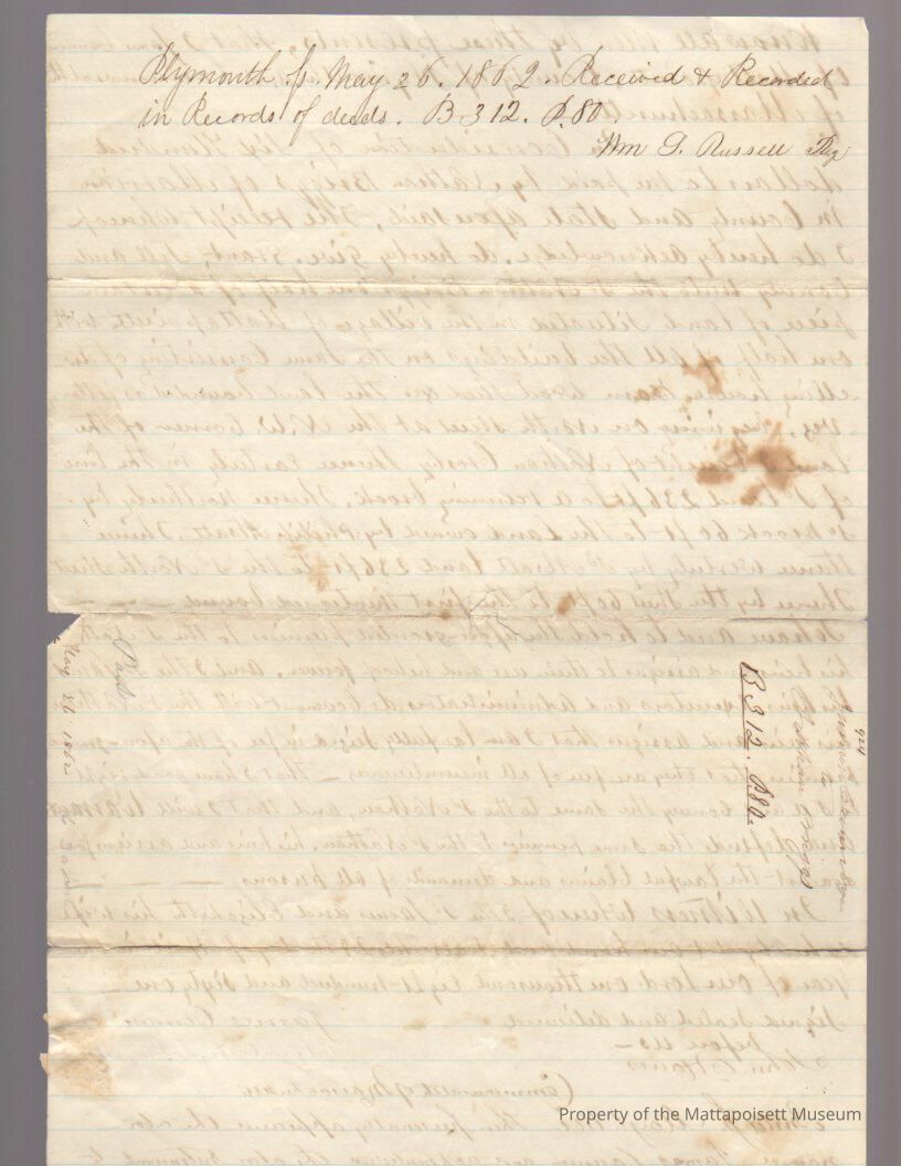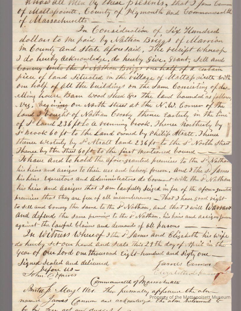 Quitclaim deed, James Cannon of Mattapoisett to Nathan Briggs of Marion, for $600, one half of a certain piece of land in the village of Mattapoisett with one-half of all the buildings, consisting of swelling house, barn, woodshed &c. Recorded May 26, 1862, book 312, page 80.Collection