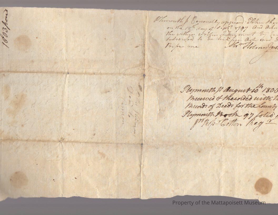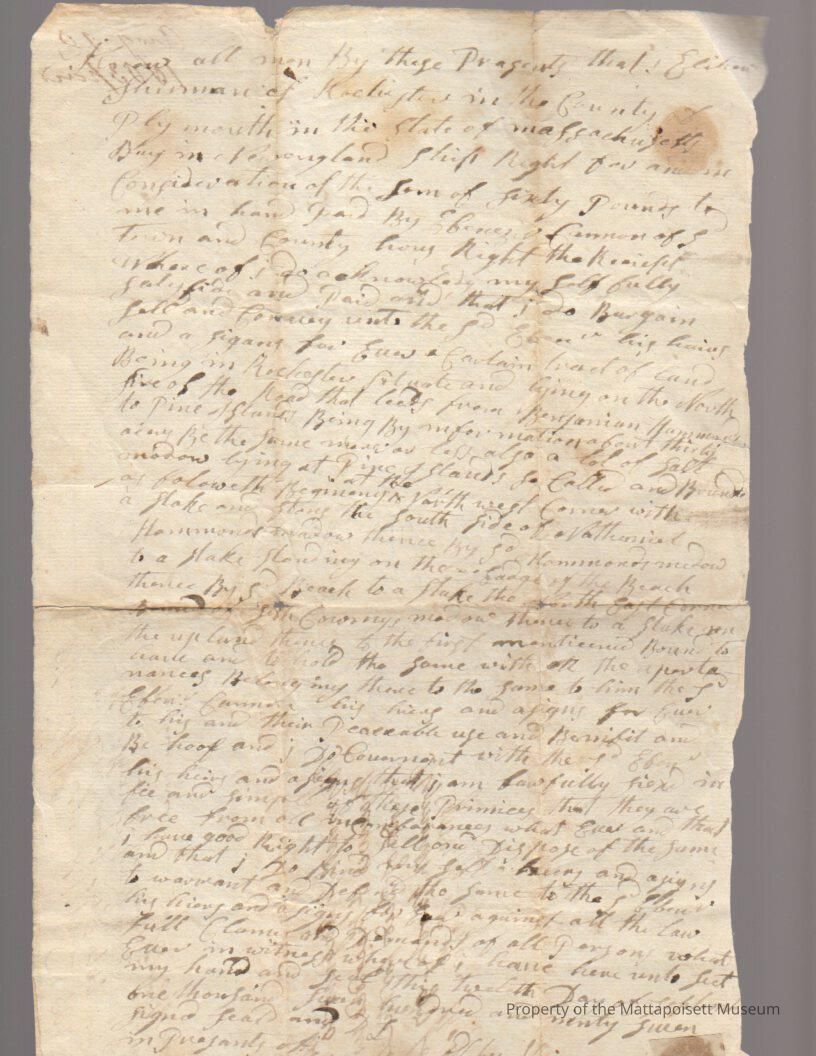 Quitclaim deed, Eliakim Sherman (ship right) of Rochester to Ebenezer Cannon (house right) of Rochester, for 60 pounds, land in Rochester. Recorded, August 10th 1803, book 97, folio [].Collection