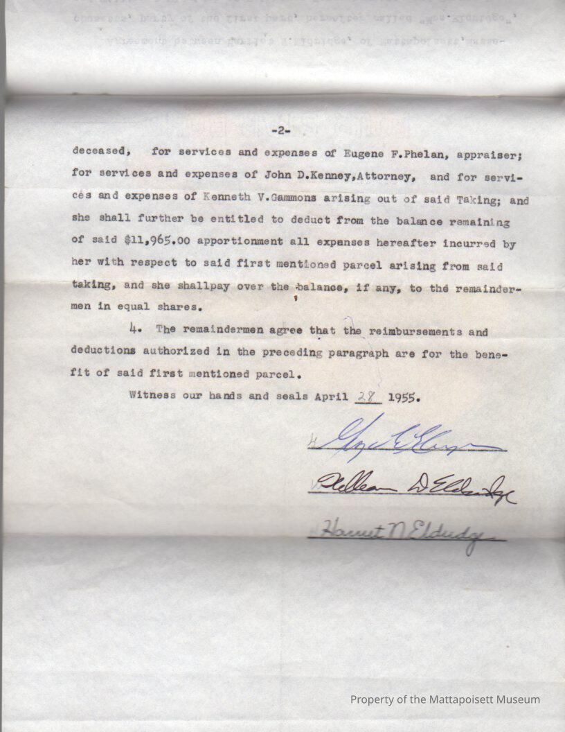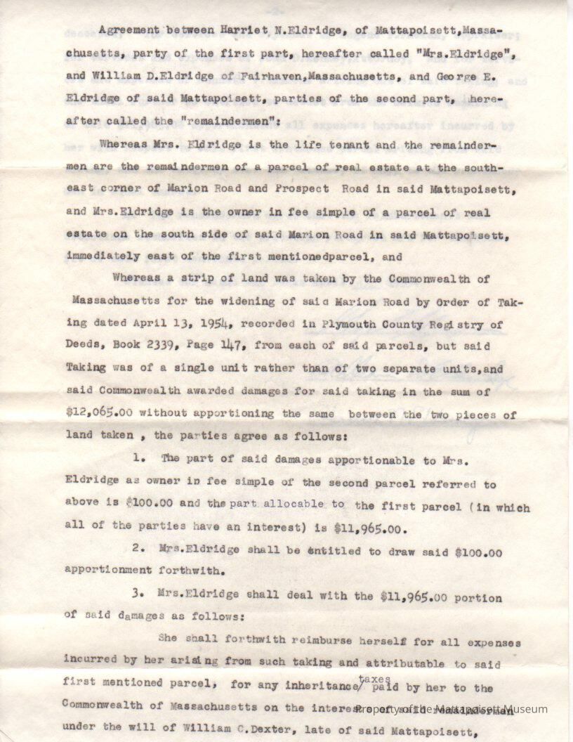 Agreement between Harriet N. Eldridge and William D. Eldridge and George E. Eldridge, Mrs. Eldridge as life tenant on parcel south-east corner of Marion Road and Prospect Road. Widening Marion Road, on land taken by Commonwealth of Massachusetts, April 13, 1854 (book 2339, page 147).Collection