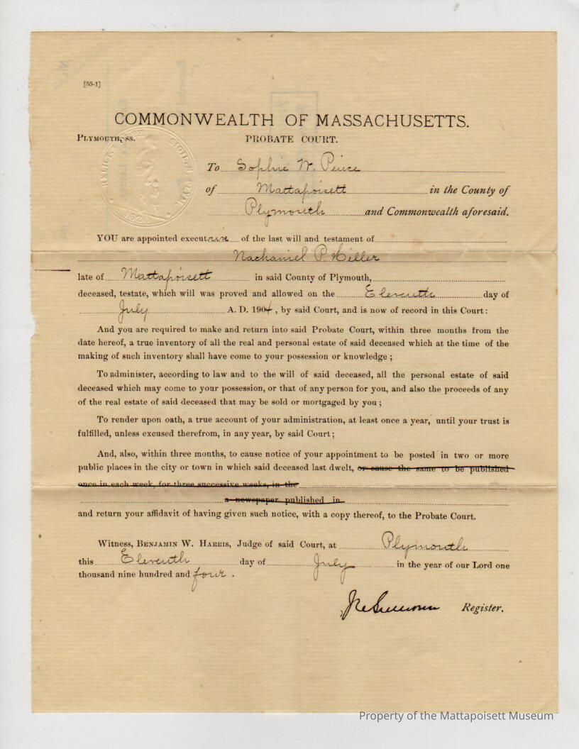 Summons to Probate Court for Sophie W. Price, appointed executrix for the last will and testament for Nachaniel P. Hiller, late of Mattapoisett.Collection