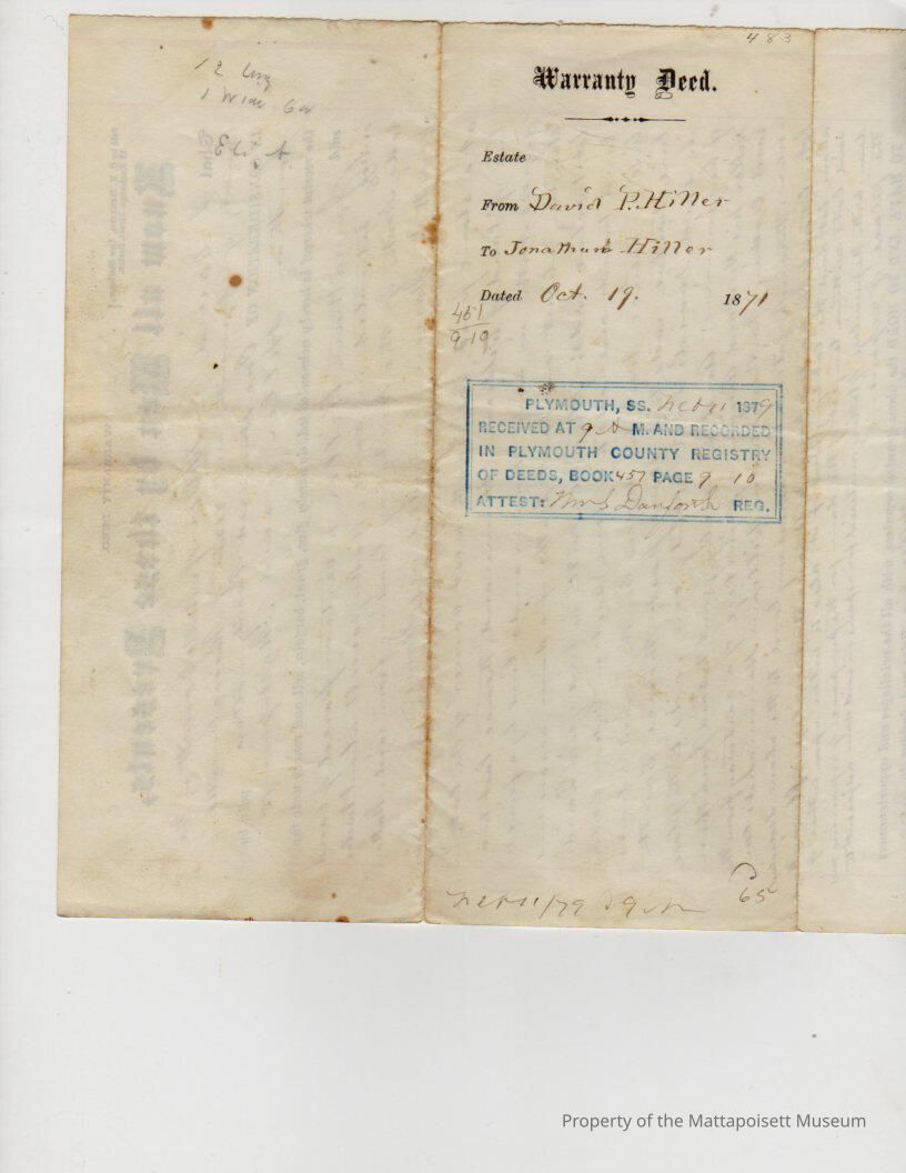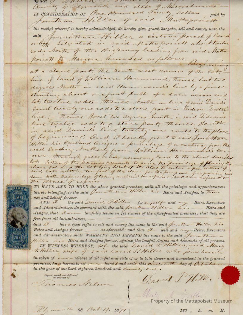 Quitclaim deed, David P. And Mary A. Hiller to Jonathan Hiller, land for $120, 12 rods north of road from Mattapoisett to Marion. Recorded February 11, 1879, book 457, page 9-10.Collection