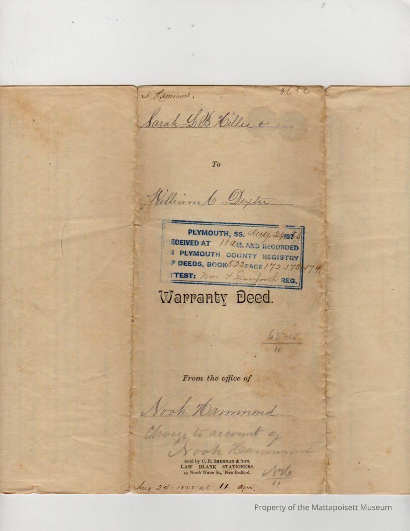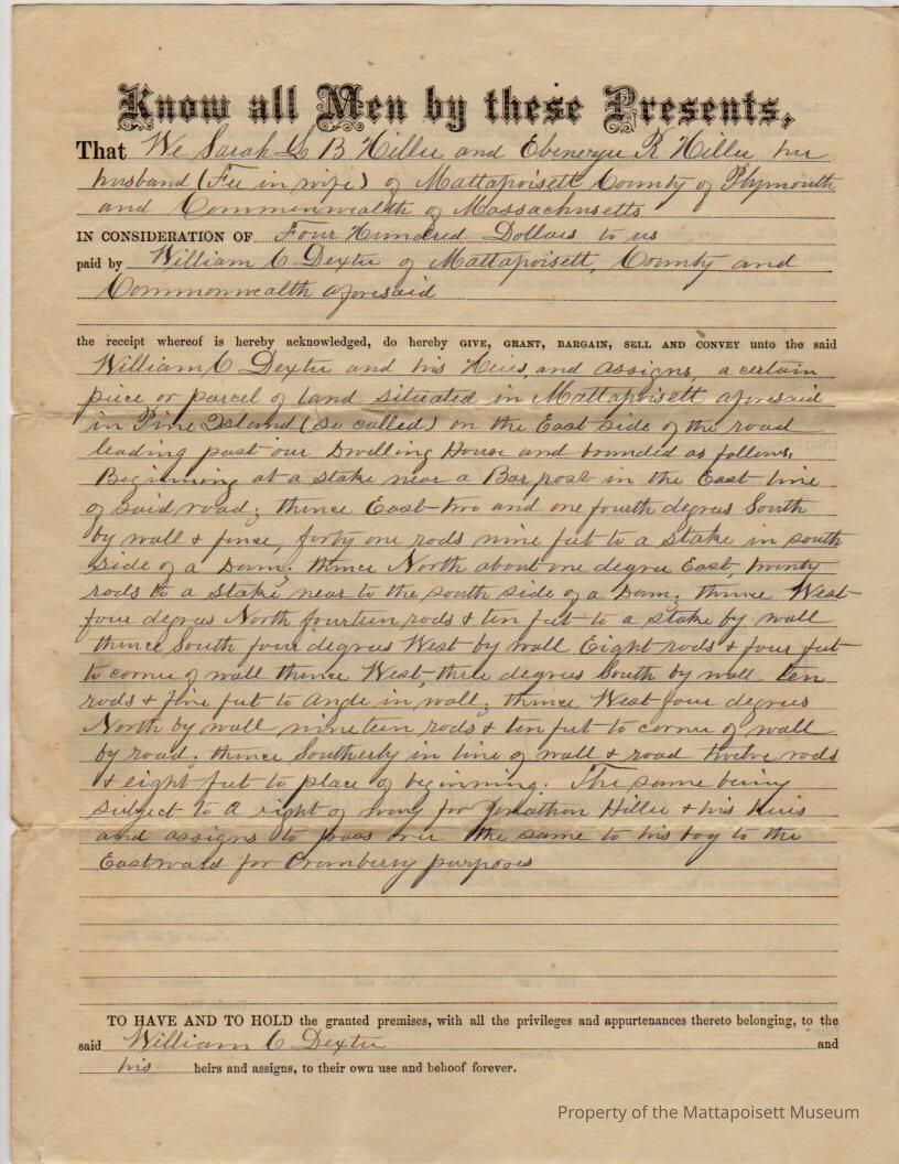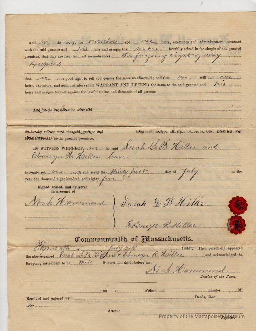 Quitclaim deed, Sarah L'B. and Ebenezer R. Hiller of Mattapoisett to William C. Dexter of Mattapoisett, for $400, land in Mattapoisett in Pine Island. Recorded August 24, 1885, book 522, pages 172-174.Collection