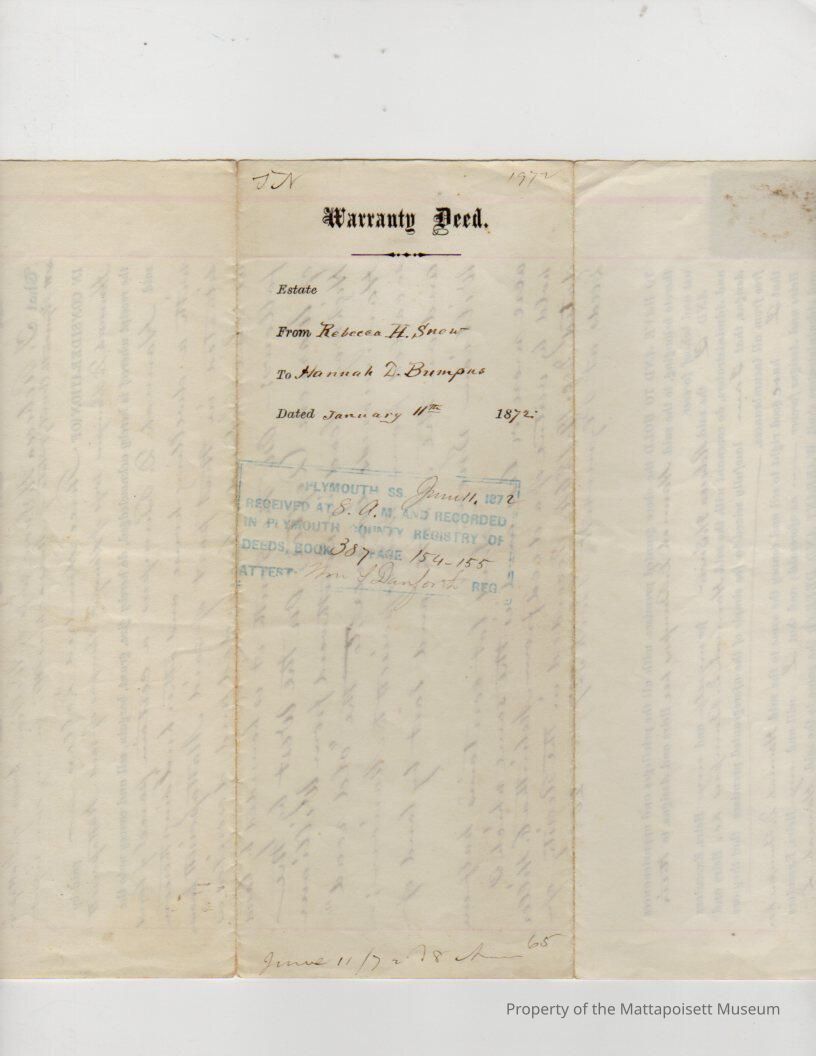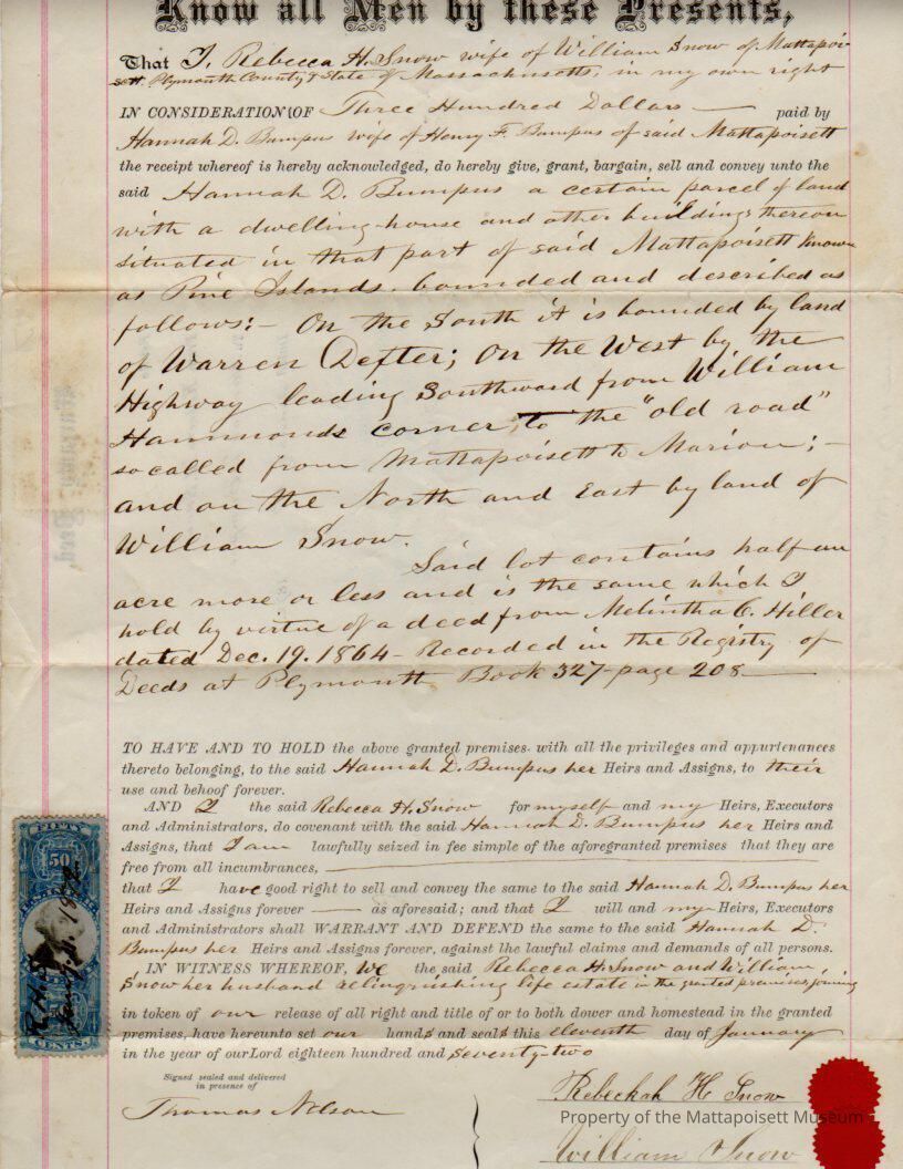 Quitclaim deed, Rebecca H. Snow (wife to William Snow) of Mattapoisett to Hannah D. Bumpus (wife of Henry F. Bumpus) of Mattapoisett, land, dwelling house and buildings in Pine Islands for $300. Recorded January 11, 1872, book 387, pages 154-155.Collection