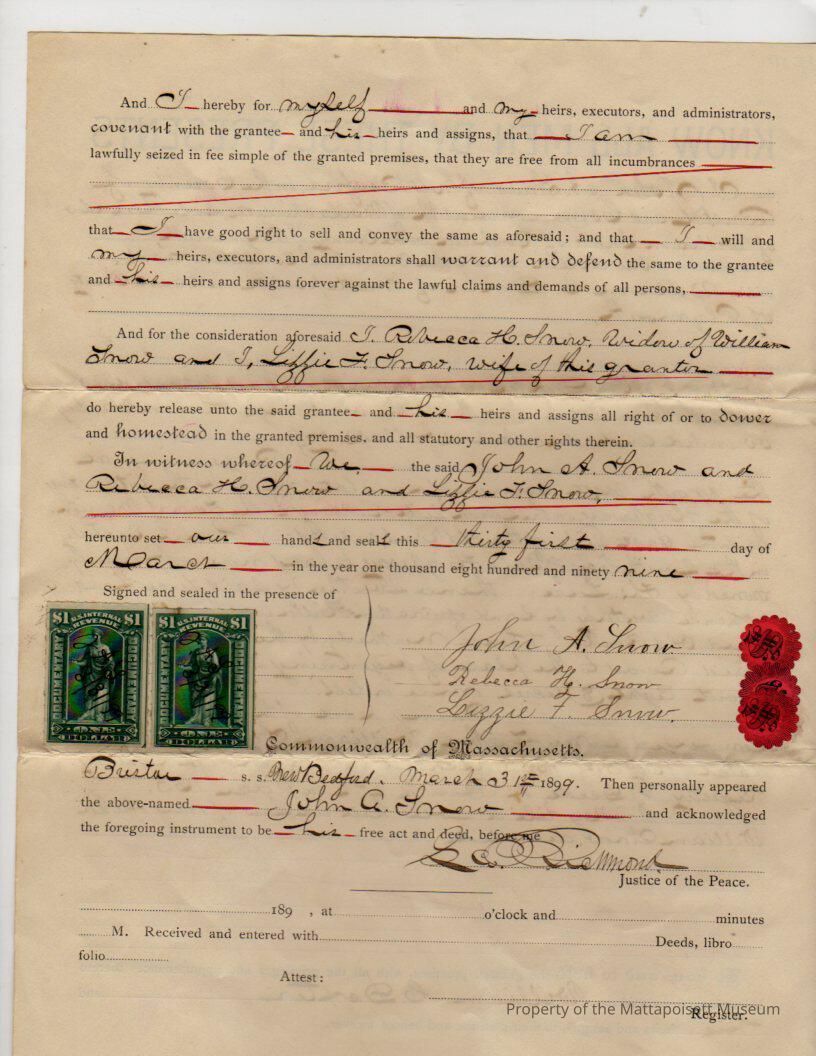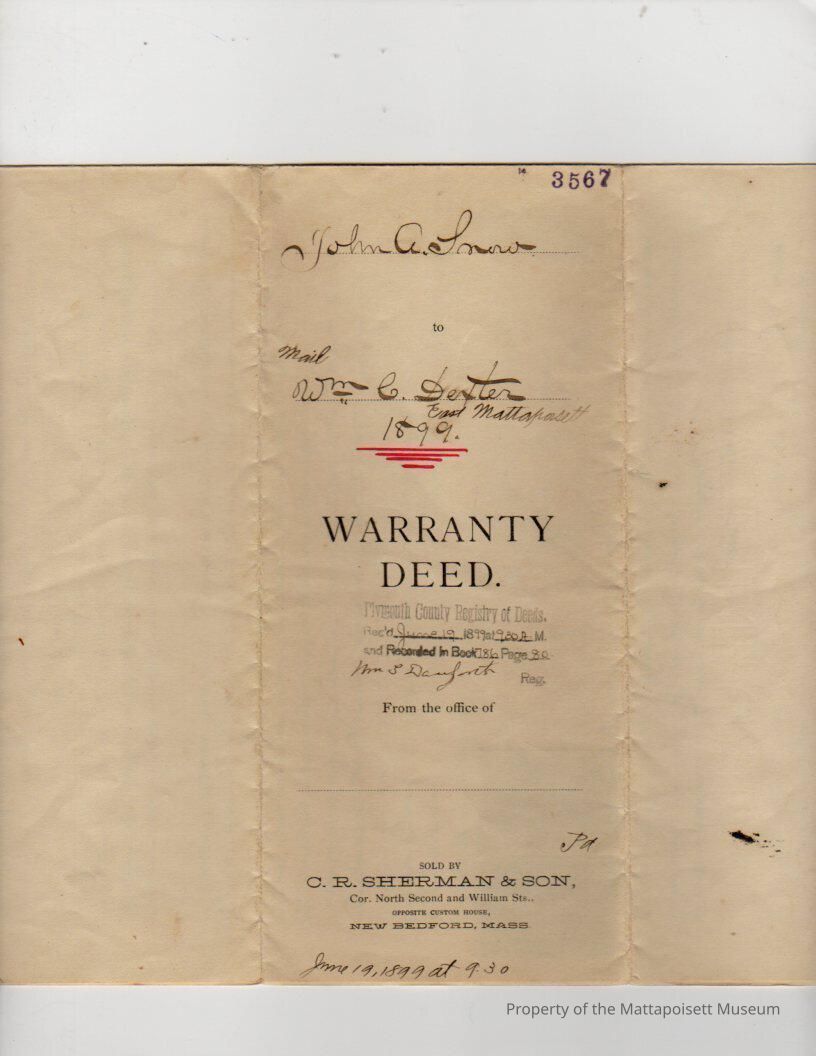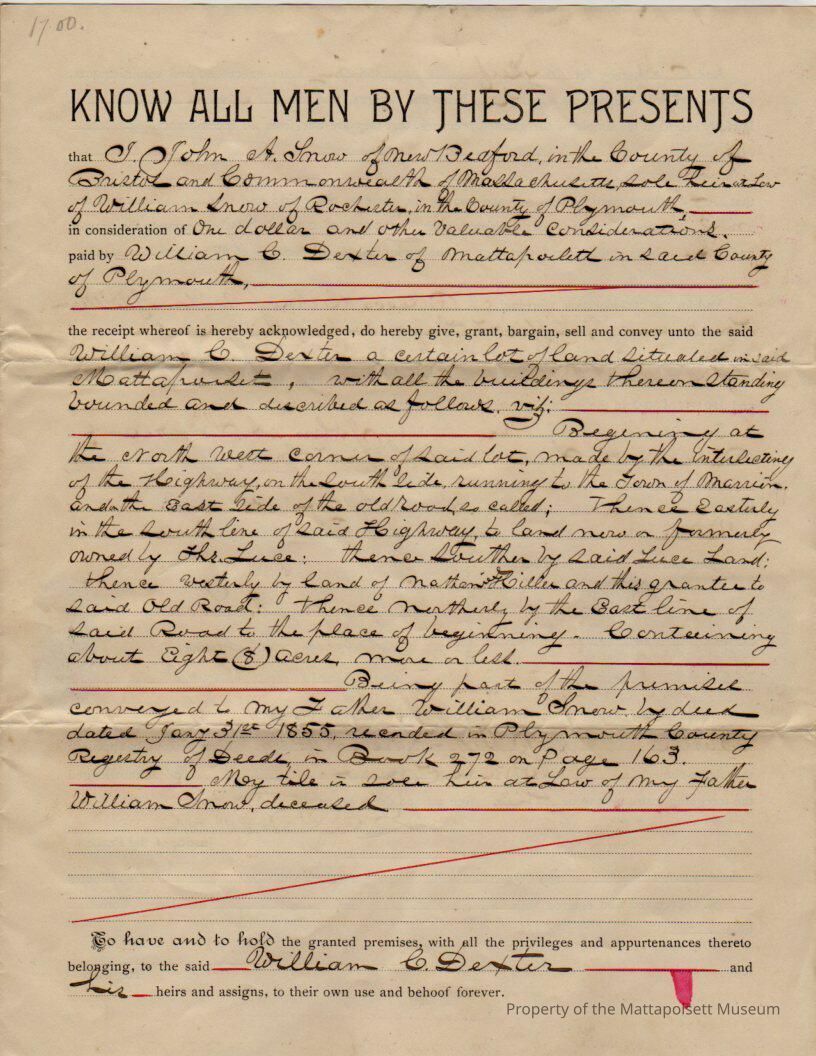 Quitclaim Deed, John A. Snow (sole heir to William Snow) of New Bedford to William C. Dexter of Mattapoisett, land in Mattapoisett with buildings, for $1 and other valuable considerations. Recorded June 19, 1899, book 786, page 80.Collection
