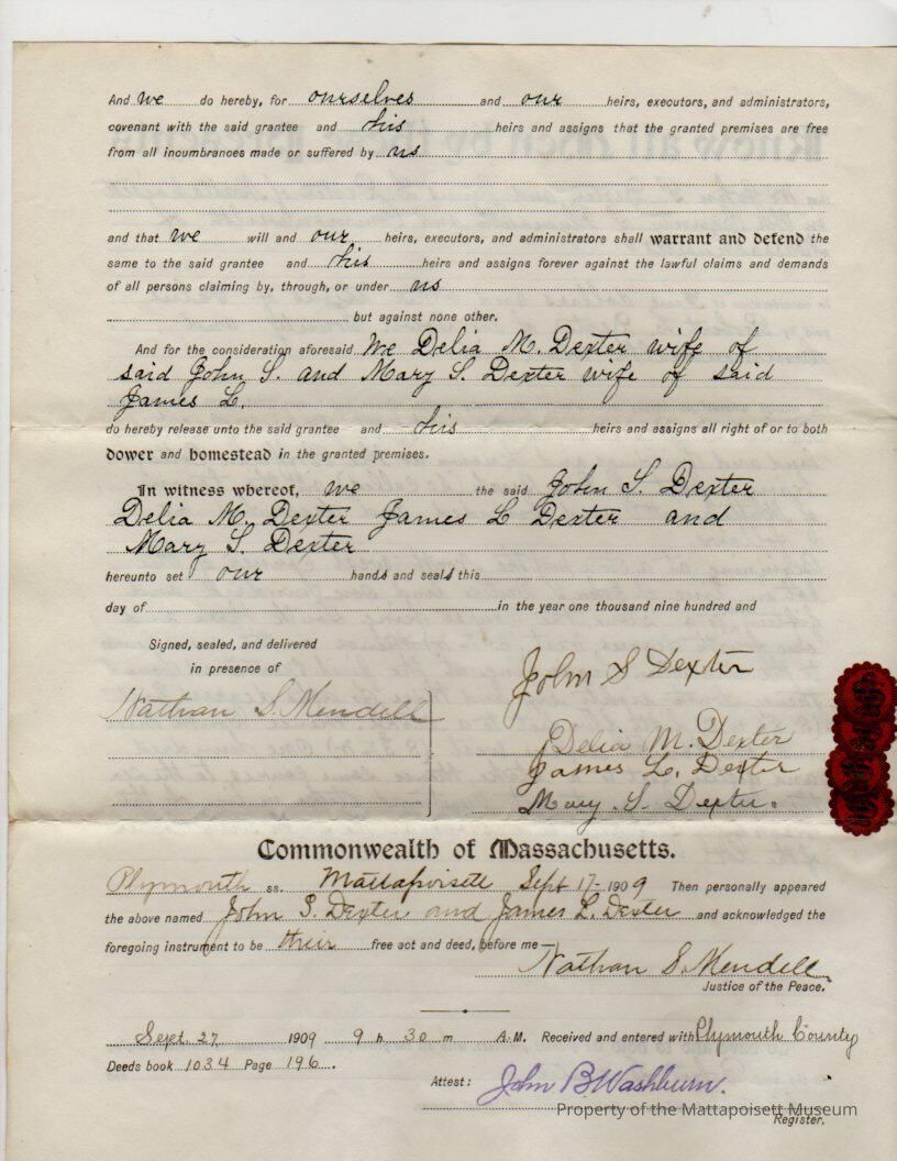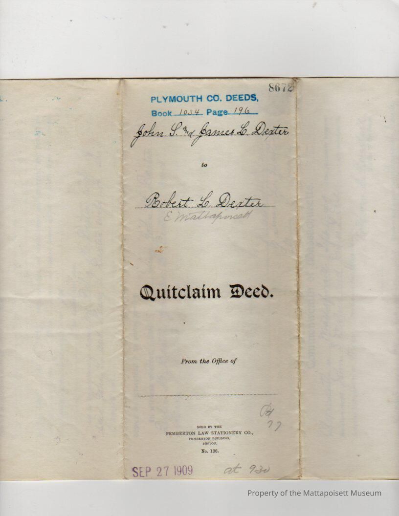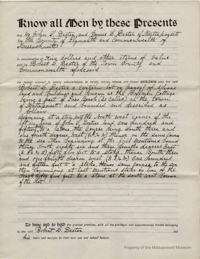 Quitclaim deed, John L. Dexter and James L. Dexter of Mattapoisett to Robert L Dexter of Rochester, shore land and buildings known as the "Hoffman Cottage", starting at Pico Beach for $5. Recorded September 27, 1909, book 1034, page 196.Collection