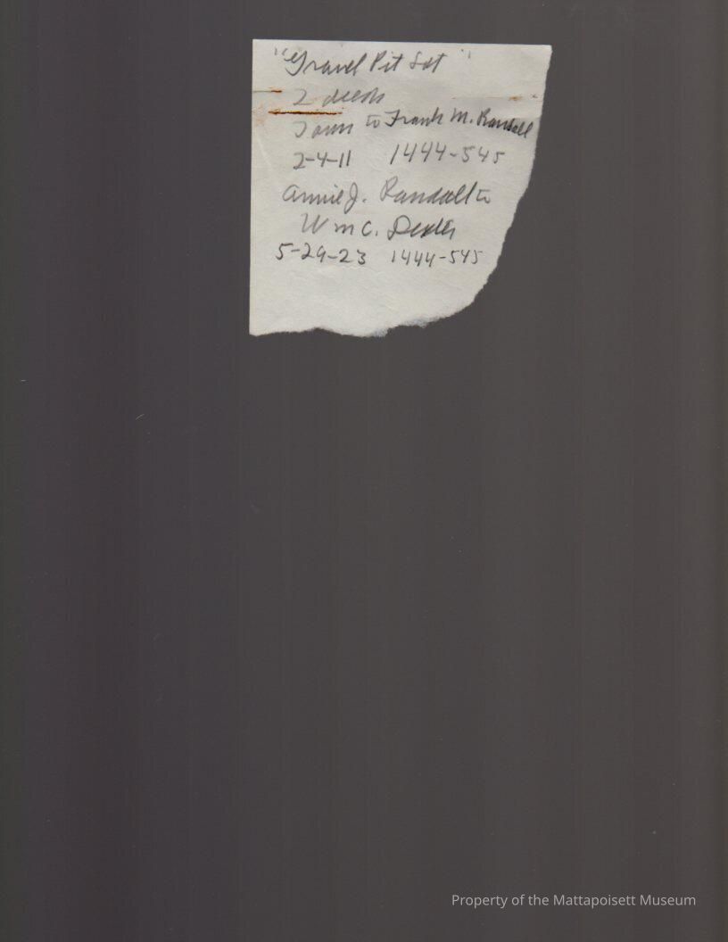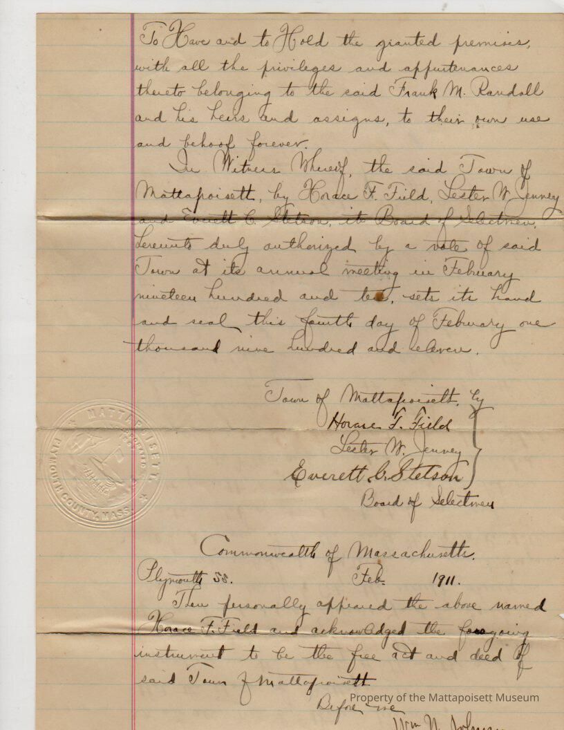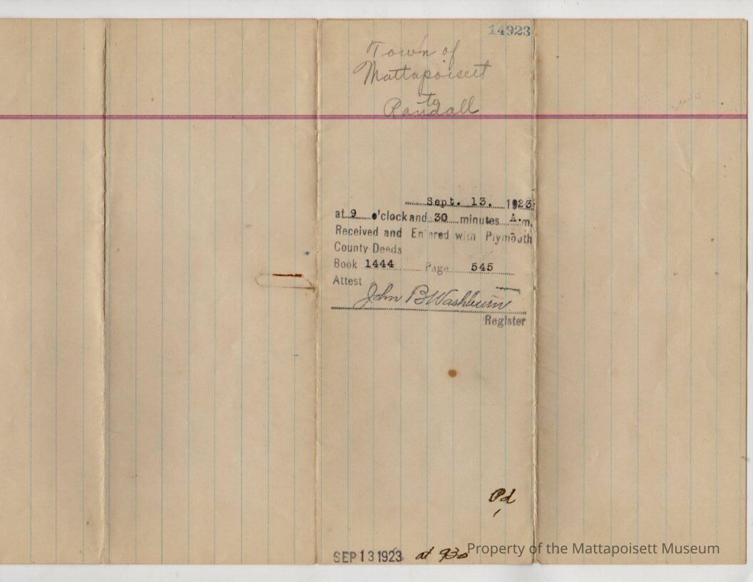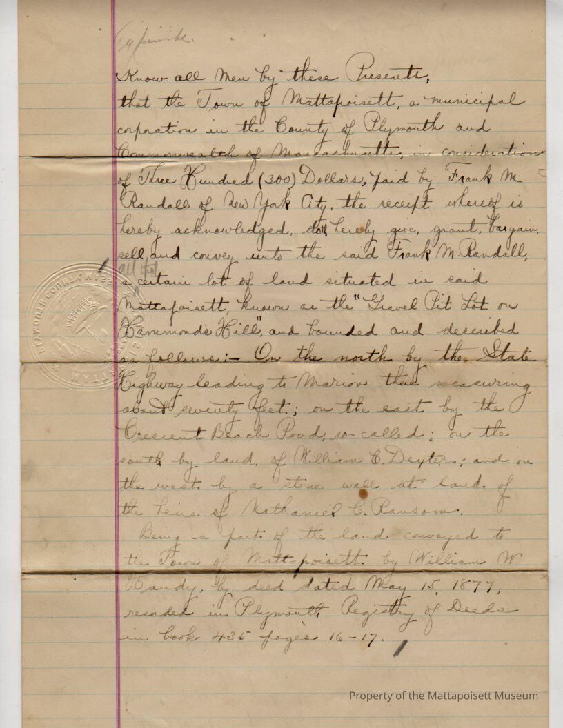 Quitclaim Deed, Town of Mattapoisett (Board of Selectmen: Horace F. Field, Lester W. Jenney, Everett C. Stetson) to Frank M. Randall of New York City, a certain lot of land known as the "Gravel Pit lot on Hammond's Hill" for $300. Recorded September 13, 1923, book 1444, page 545.Collection