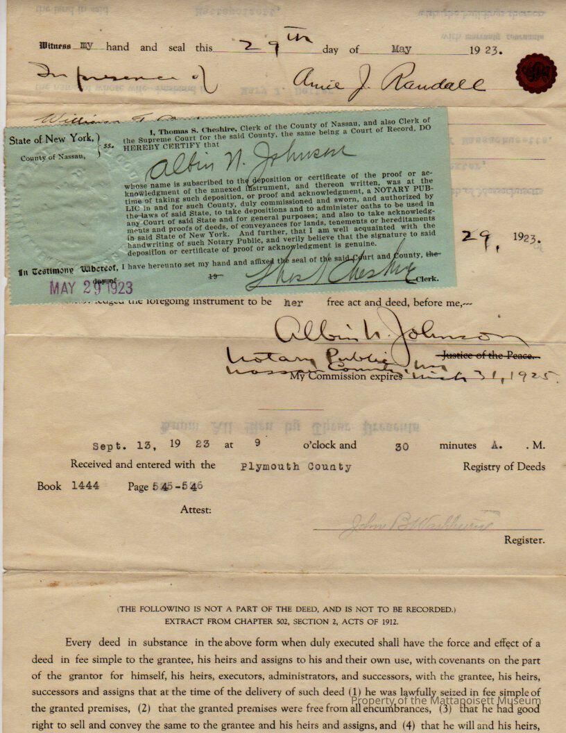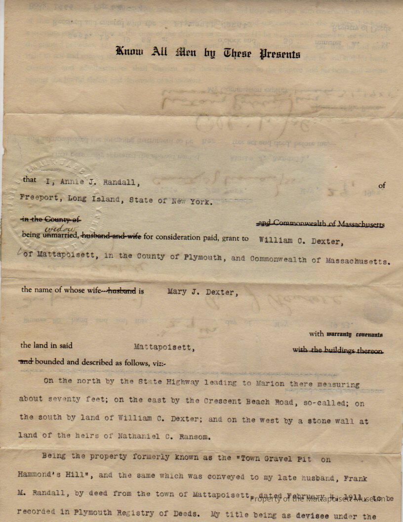 Quitclaim deed, Annie J. Randall of Freeport, Long Island to William C. Dexter. Recorded September 13, 1923, book 1444, pages 545-546.Collection