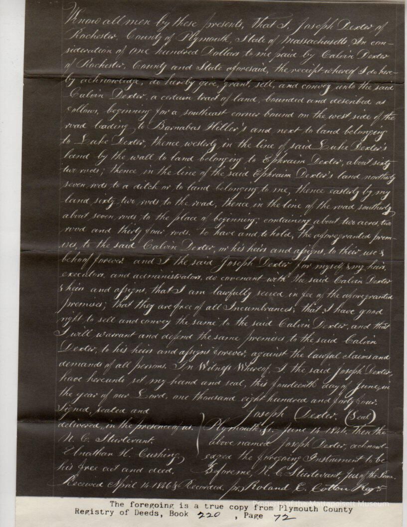 "True copy" of deed, Joseph Dexter to Calvin Dexter, land for $100. Book 220, page 72.Collection