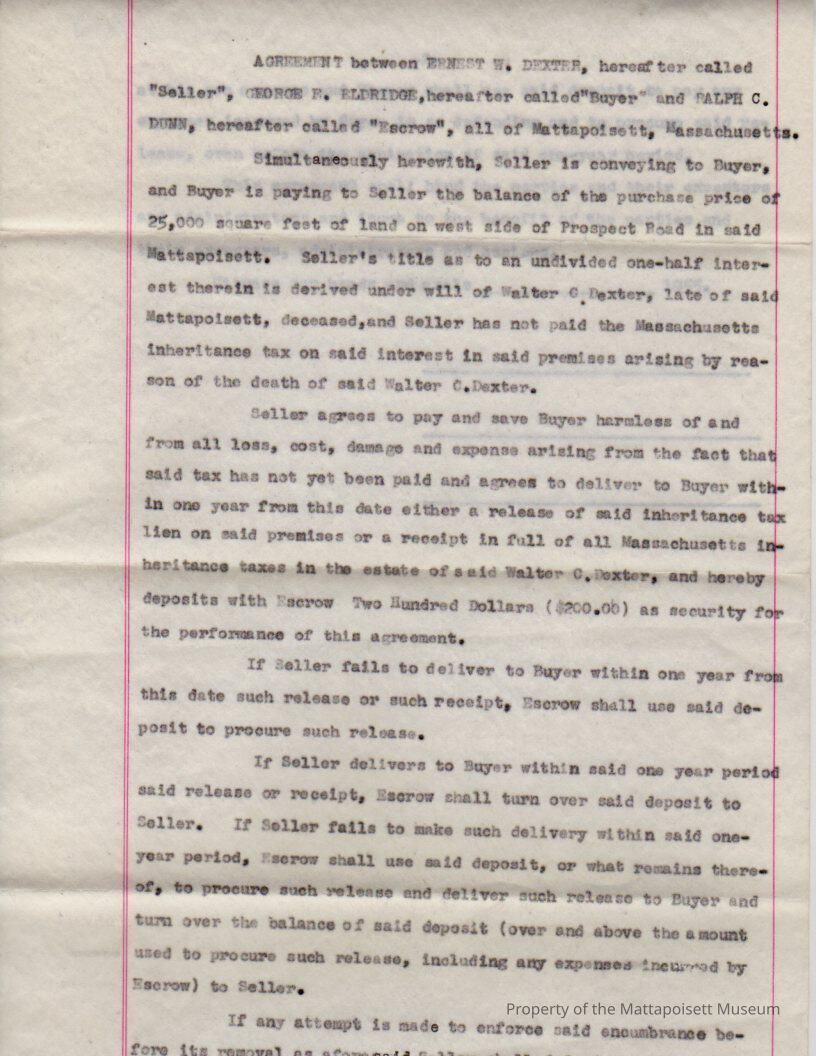 Deed between Ernest W. Dexter and George E. Eldridge (Ralph C. Dunn holding escrow). 25,000 square feet of land on the west side of Prospect Road.Collection
