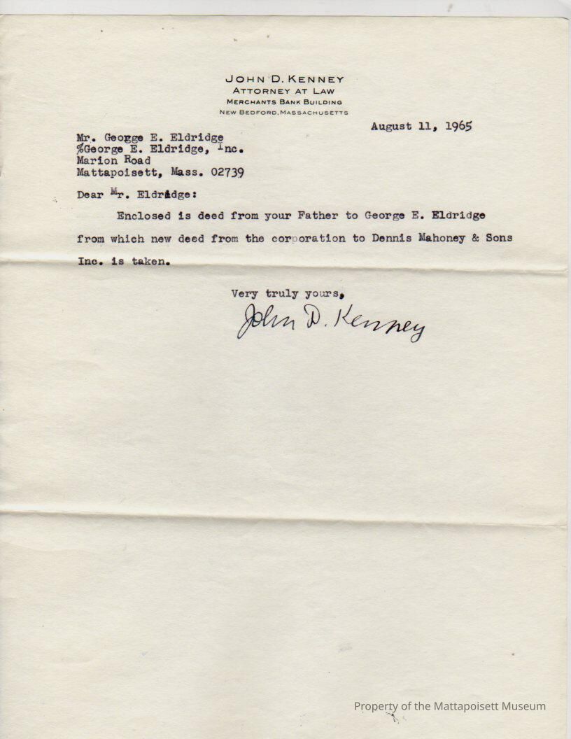 Letter to George E. Eldridge from John D. Kenney, attorney, with deed from "your Father" to George E. Eldridge, new deed from the corporation to Dennis Mahoney & Sons Inc is taken.Collection